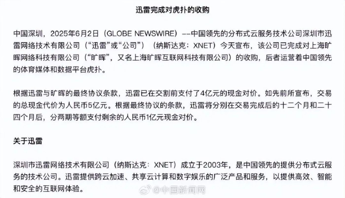 6月2日,迅雷(NASDAQ: XNET)正式公告完成对虎扑运营方上海匡慧网络科技有限公司的收购。根据协议,交易总现金对价为5亿元人民币,迅雷已在交割前支付4亿元,剩余1亿元将在交易完成后12个月和24个月分两期等额支付。