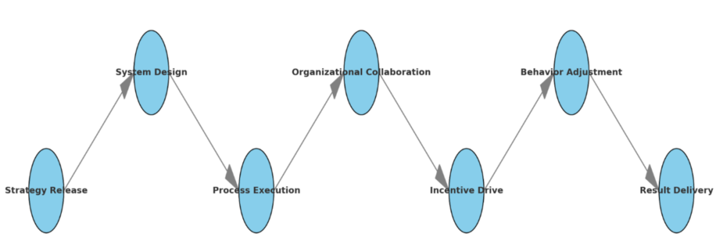 对示意图的说明:从战略发布(Strategy Release)到系统设计(System Design),再到流程落地(Process Execution)、组织协同(Organizational Collaboration)、激励驱动(Incentive Drive)、行为调整(Behavior Adjustment),最终达到结果兑现(Result Delivery)。