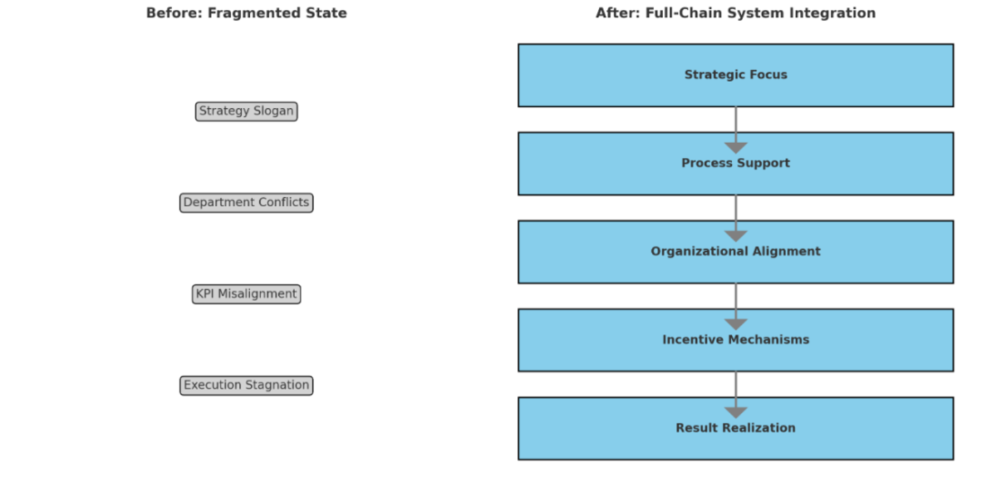 改造前左“Fragmented State”(战略口号、部门内耗、KPI错位、执行停滞),改造后右“Full-Chain System Integration”分层结构(战略聚焦、流程支撑、组织对齐、激励机制、结果实现)。