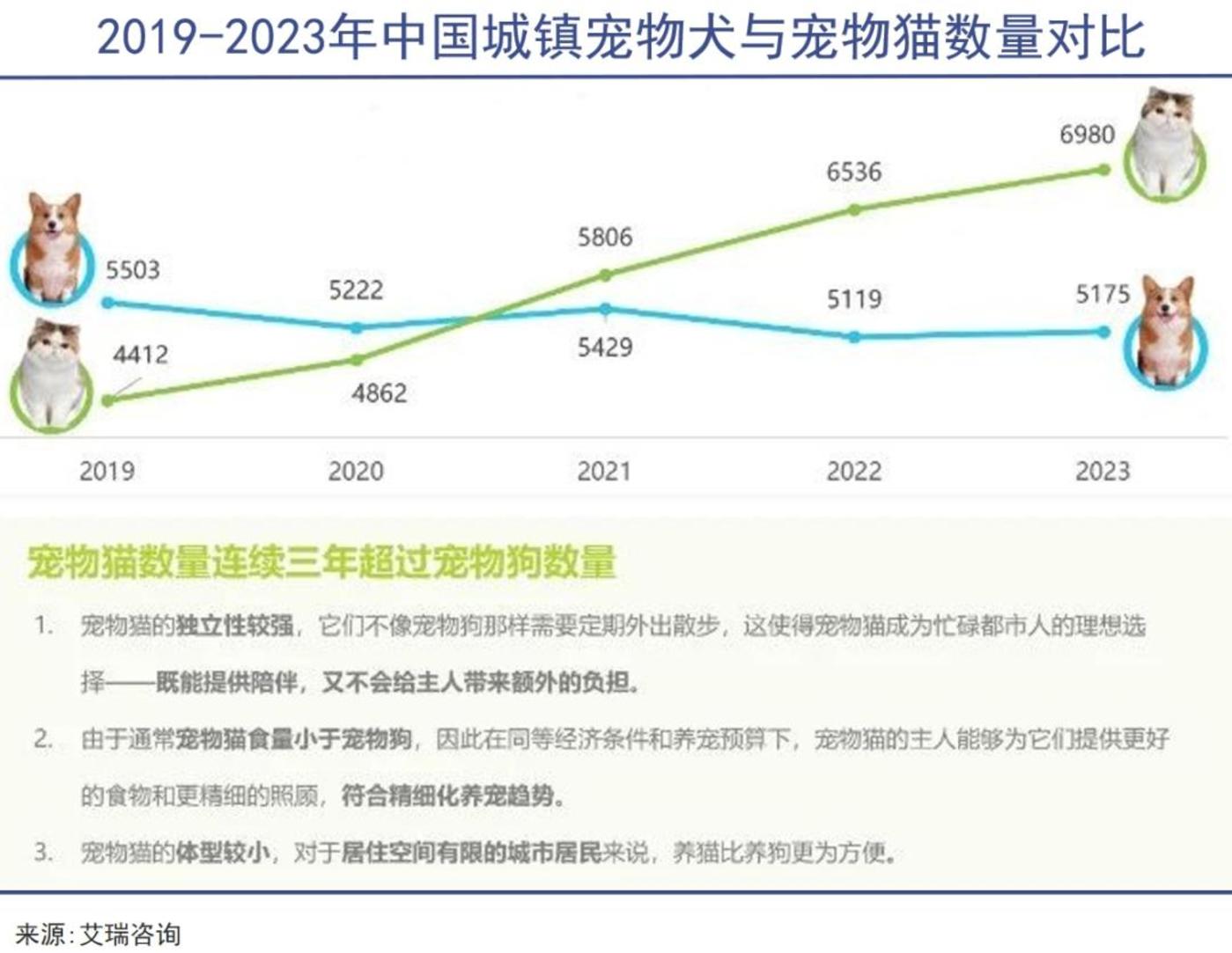 根据艾瑞咨询的数据,2021年后,我国宠物猫的数量即超过了宠物狗。到2023年,宠物猫数量达到6980万只,较2022年增长了6.8%;而宠物犬数量为5175万只,仅增长了1.1%。到2024年,宠物猫数量进一步增长至7153万只,宠物犬数量为5258万只。这一变化主要是由于一二线城市居民养猫的数量逐渐增多。