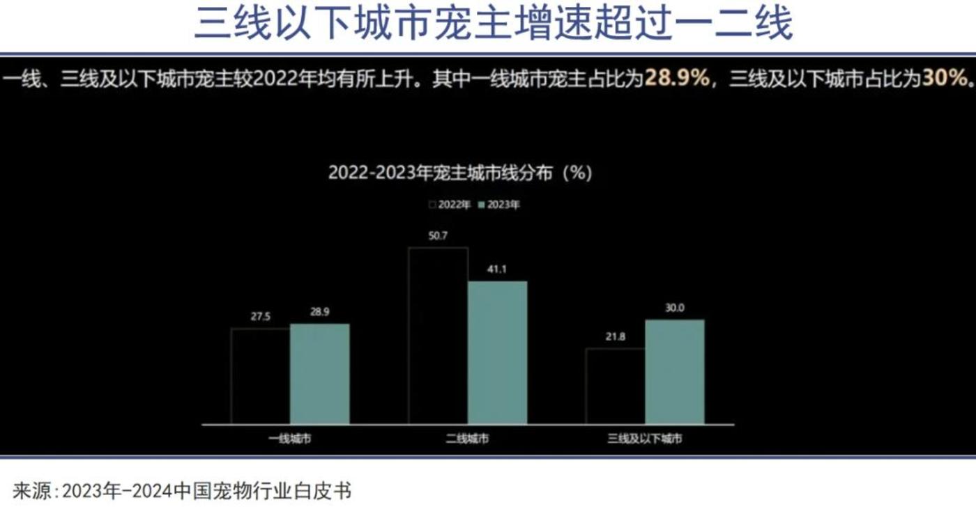 据《2023年-2024中国宠物行业白皮书》数据显示,2022年至2023年期间,三线及以下城市的宠主占比从21.8%大幅提升至30%,增加了8.2%。相比之下,一线城市宠主的占比仅微升1.4%,二线城市宠主占比则下降了近10%。