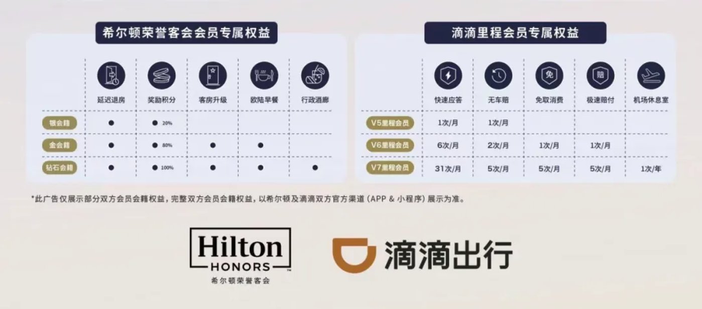比如,希尔顿与滴滴的合作。滴滴V6、V7、V8里程会员将根据会员等级,获得希尔顿荣誉客会相应会籍,并享受如房型升级、免费早餐、延迟退房等礼遇。不同级别的会员,对应享受快速应答、免费取消、机场休息室等多重权益。