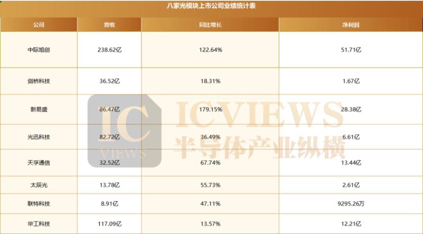 截止到今年四月底,中国光模块上市公司先后有8家公司发布2024年业绩报告,包括中际旭创、剑桥科技、新易盛、光迅科技、剑桥科技、天孚通信、天辰光、联特科技。