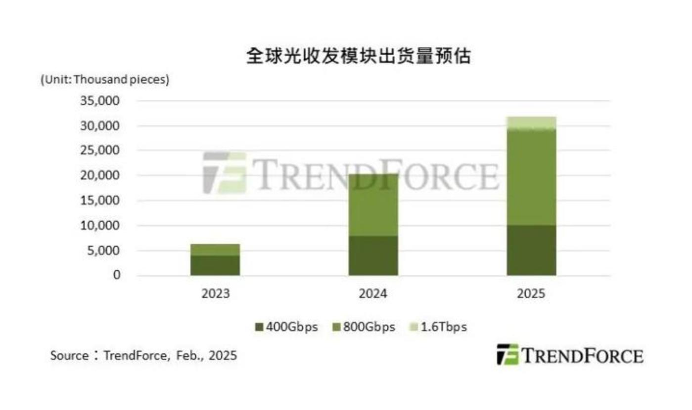 TrendForce报告称,2023 - 2025 年,全球光收发模块出货量呈快速增长趋势。2023 年基数较低,2024年大幅提升,2025年预计进一步冲高,反映光模块市场需求在持续扩张。这一爆发式增长的背后,是AI训练集群对带宽需求的几何级攀升——单台搭载800G光模块的交换机,其数据吞吐量足以支撑千亿参数模型的实时训练。