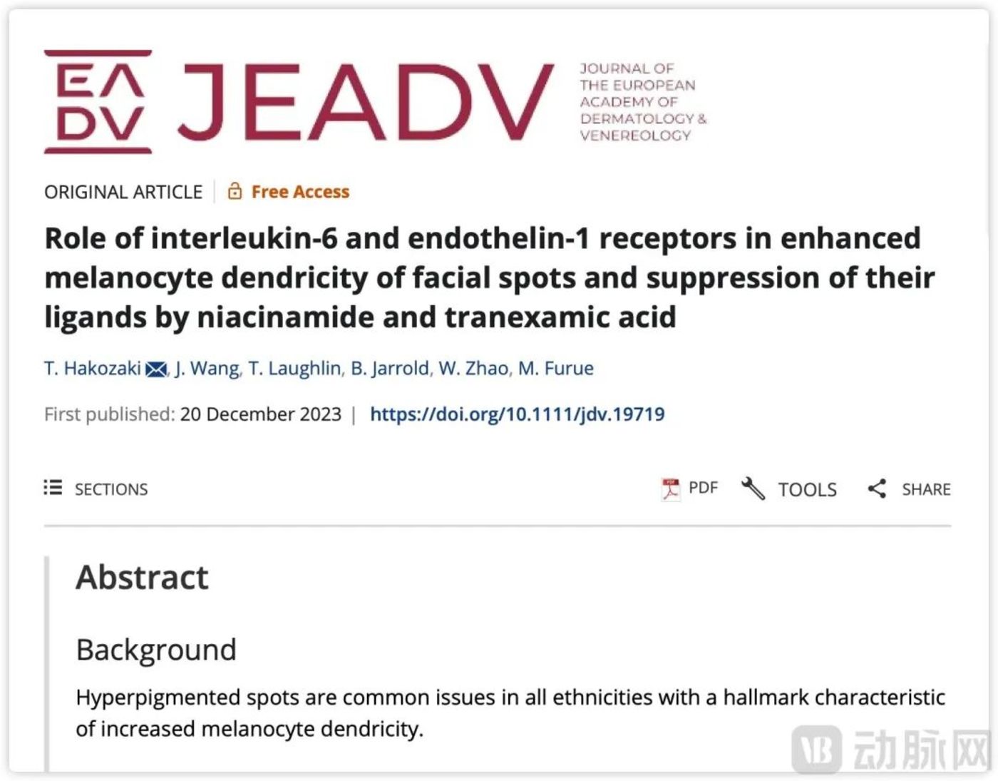 2023年,宝洁在JEADV(《欧洲皮肤性病学杂志》)上发表了题为《IL-6和ET-1的受体在面部色斑黑素细胞树突增多中的作用以及烟酰胺和传明酸对其的抑制作用》的论文,宣布其对传明酸在美白方面的研究取得新进展。