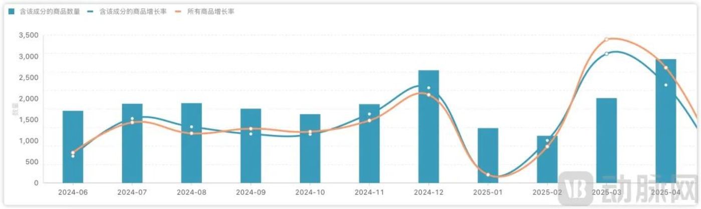 据美丽修行大数据显示,2024年,国内产品名含有“传明酸”字样的共计新增注册备案918个,近三年复合增长率超80%;截至2025年5月,名称含有“传明酸”字样的产品共计超3000个,同比增长超100%;含有该命名产品的品牌数和生产传明酸成分产品的工厂数,也都保持双位数增长,分别达63%和70%。