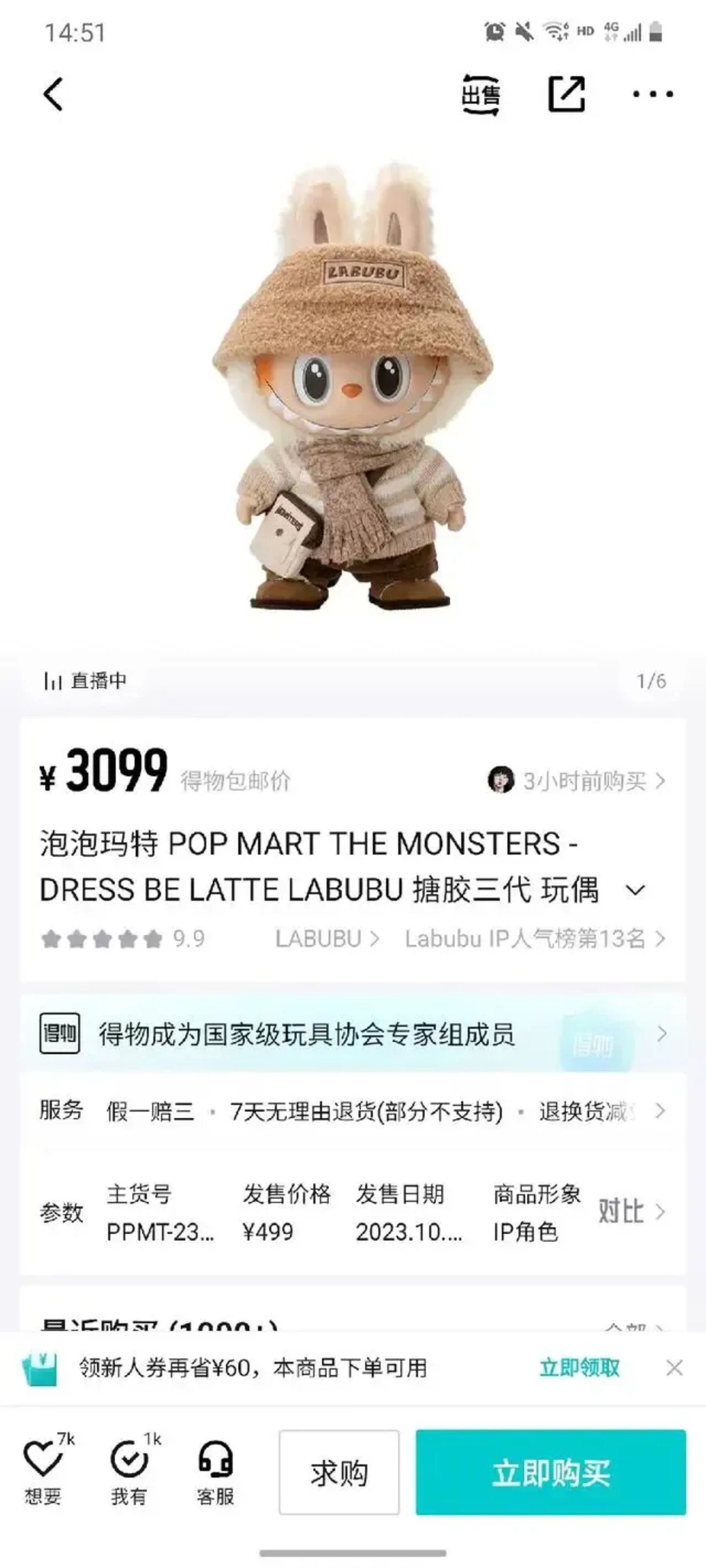 Labubu搪胶工艺玩偶系列“三代”定价为499元人民币,对于一款玩偶而言,这个价格本身已经不算低。但真正让它与奢侈二字挂钩的,是其在二级市场上的表现。你很难以原价购得热门款式,二手平台上的价格动辄飙升至3000多元人民币,甚至更高。