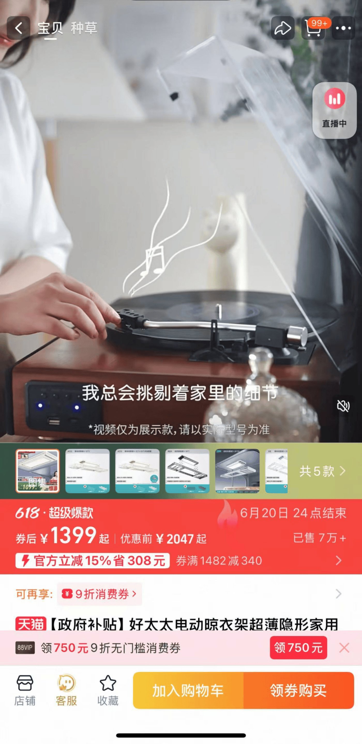 在好太太抖音直播间内,截至6月6日中午12点,定价1259元的智能“小天舱”晾衣机销售已超过1.2万单。