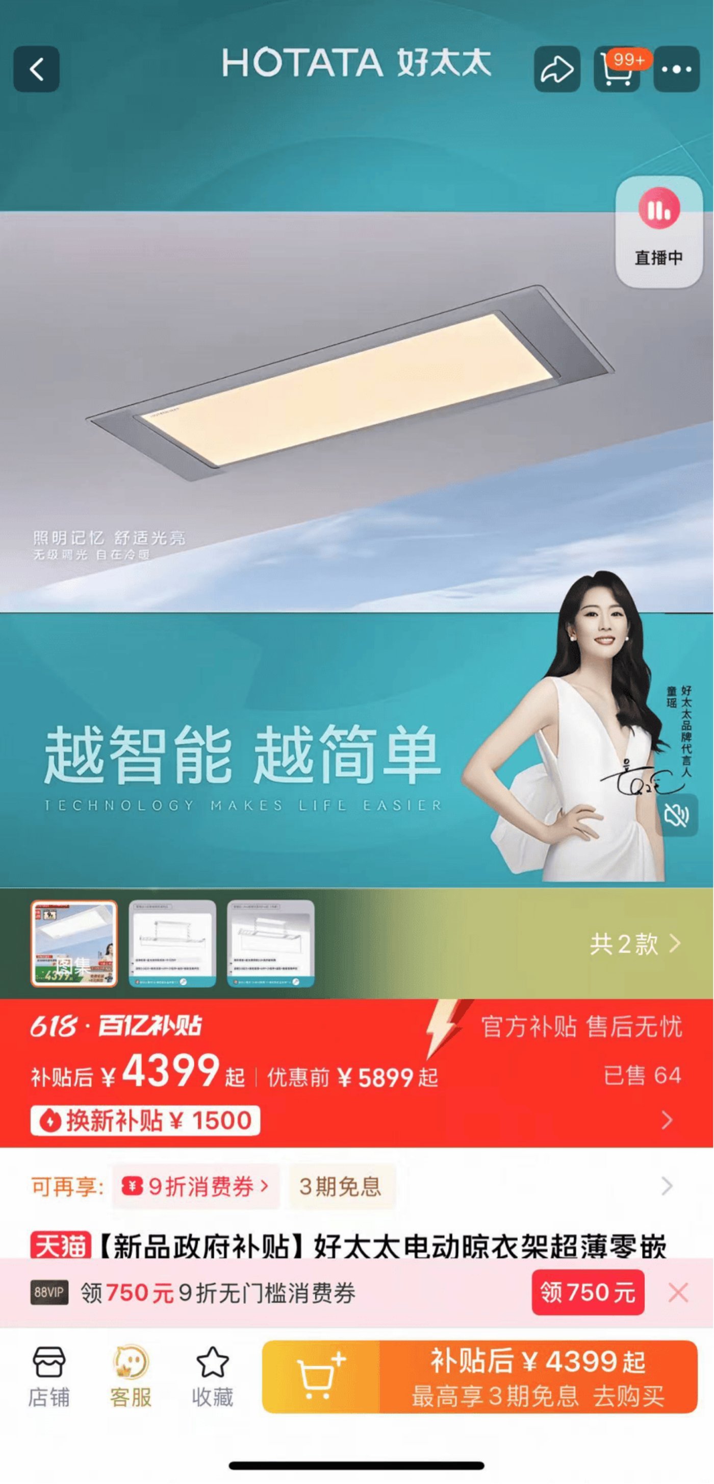 相比之下,“基础晾晒”分类中隐形“小天舱3.0”智能晾衣机具备照明、语音控制等功能,618补贴后价格为1399元起,销量达7万+,成为好太太店铺中当之无愧的销量王。