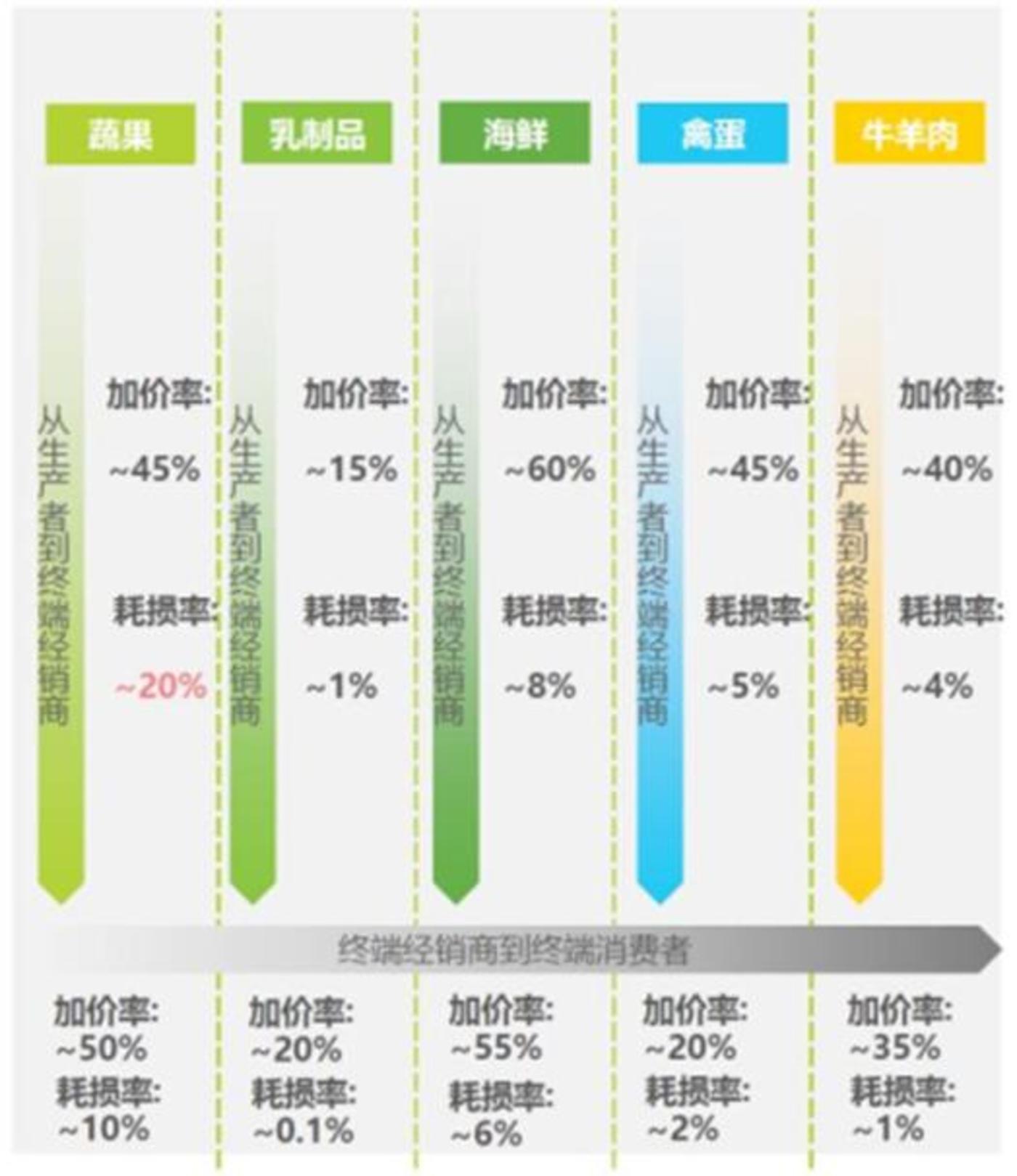 根据艾瑞咨询的数据,对于食品生鲜类,传统零售渠道都有20-55%的加价率,而且低效周转的副产物是不低的损耗率。对于加工类食品、服饰等其他产品,加价率和库存问题只会更大。
