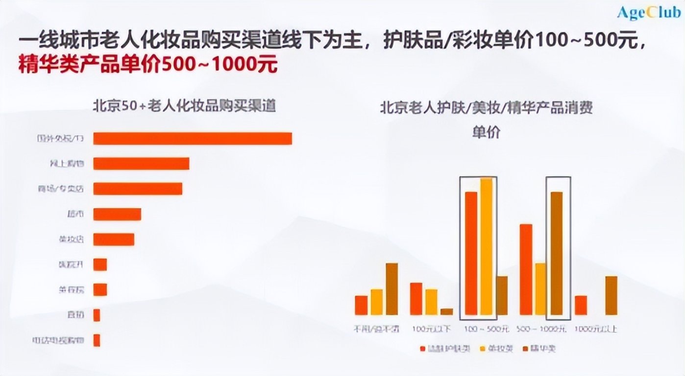 与此同时,老年人消费观念也变得更为积极,既不吝于为家人消费,也乐于"悦己"。除了保健品、医疗器械、家政服务等常规老年消费,化妆品也占有了一席之地。艾媒咨询报告显示,有92%的老年人有使用护肤化妆品的习惯,且偏好兰蔻、雅诗兰黛、资生堂等国际大牌。尤其是北上广深等一线城市,根据AgeClub的数据,北京老年人基础护肤产品消费单价100-500元,精华类产品高达千元以上。