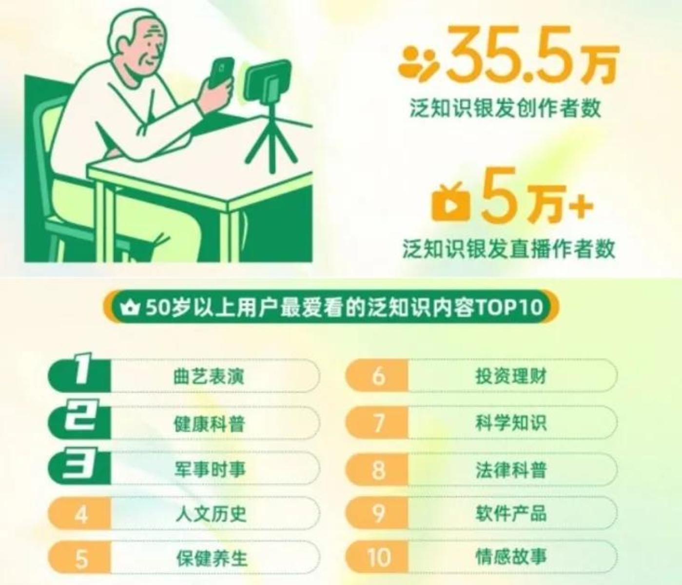 快手的老年用户群“知识味”浓郁,平台近年发力泛知识内容取得一定效果。官方数据显示,快手站内50岁以上泛知识银发创作者数量达35.5万+、直播作者数量5万+、“小满人群”日活渗透率近30%,简直是智能教育硬件、线上课程、老年教育机构的天然流量池。
