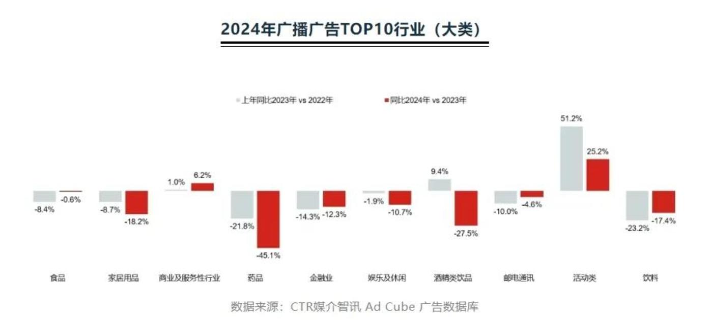 传统电视广播地位依旧突出,尤其是早已被年轻人遗忘的电台广播。CTR统计显示,去年商业及服务性机构、活动性机构广播广告投放量均录得同比增长。广播广告渠道的优势是制作成本低、播出时间灵活、伴随性强,适合投放短小精悍、有洗脑金句的产品广告,靠高频传播来巩固印象,陈李济、易开得、旺源驼奶等有鲜明卖点的品牌去年广播广告投放额就接近翻倍。