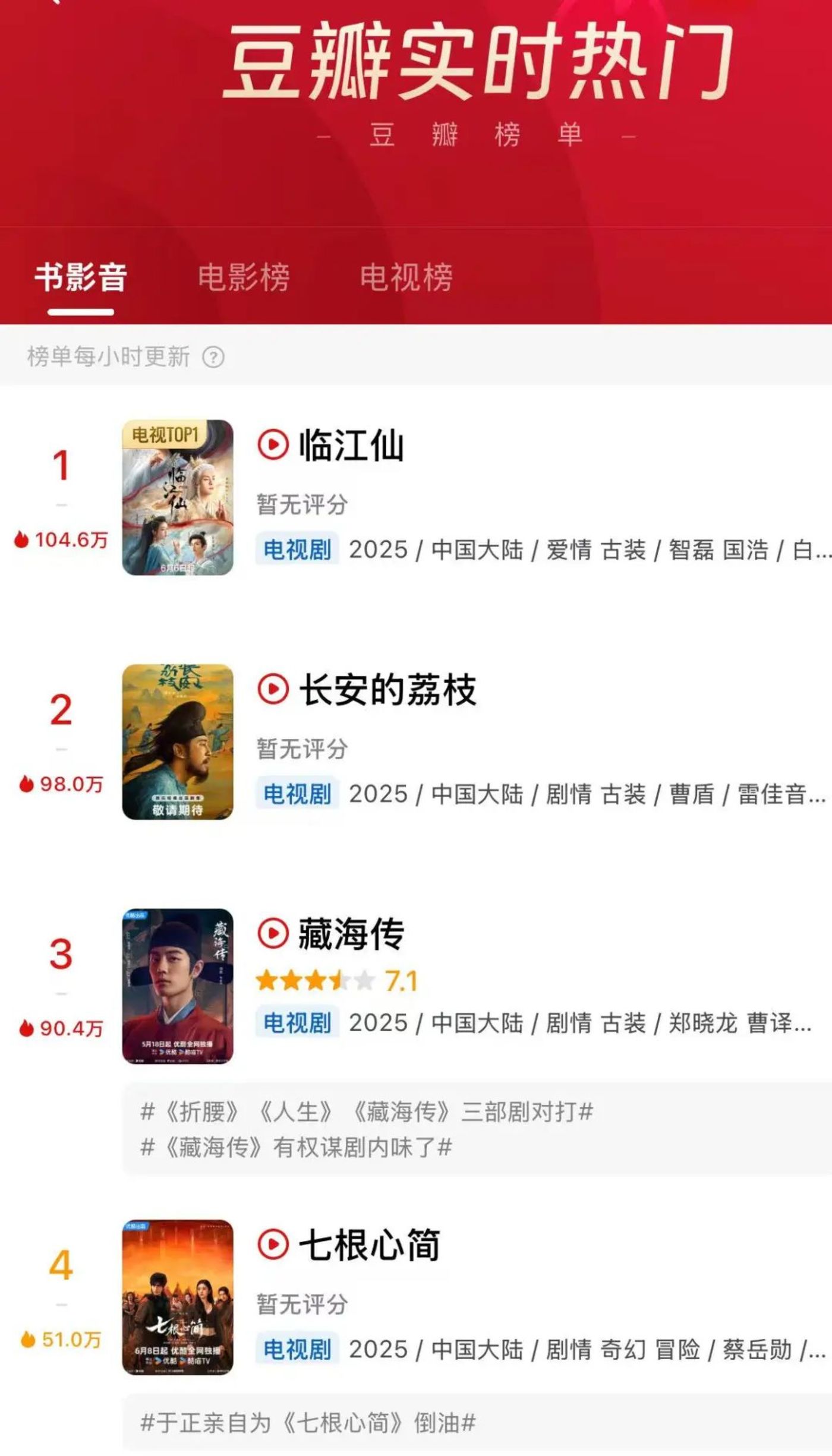 目前,《七根心简》《临江仙》《长安的荔枝》已经为剧集大盘拉起热度,文娱价值官将持续关注这个暑期档剧集市场的表现。