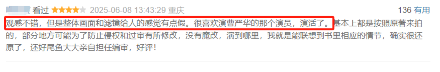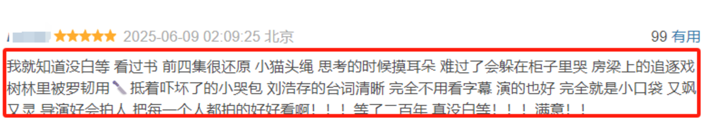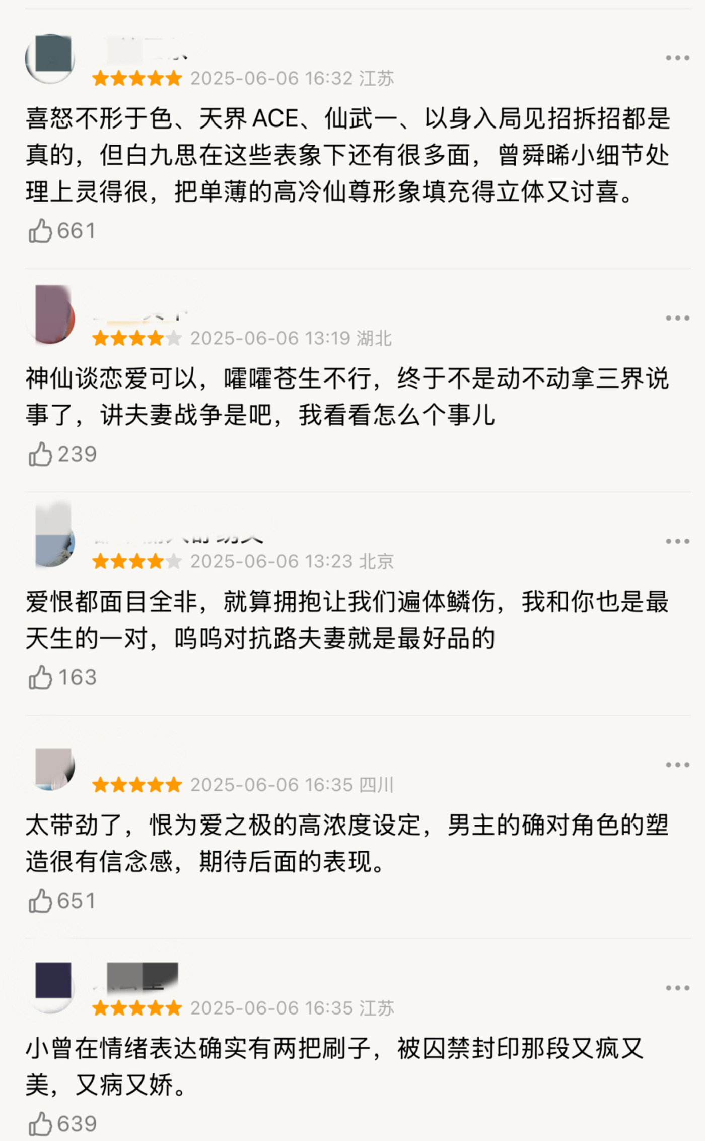 6月8日在优酷播出后,剧粉纷纷在社交平台上发表自己的看剧体验,“首更四集已看完,书粉基本满意,不过没想到一万三的妆造整这么帅哈哈哈”“我就知道没白等,看过书,前四集很还原”。