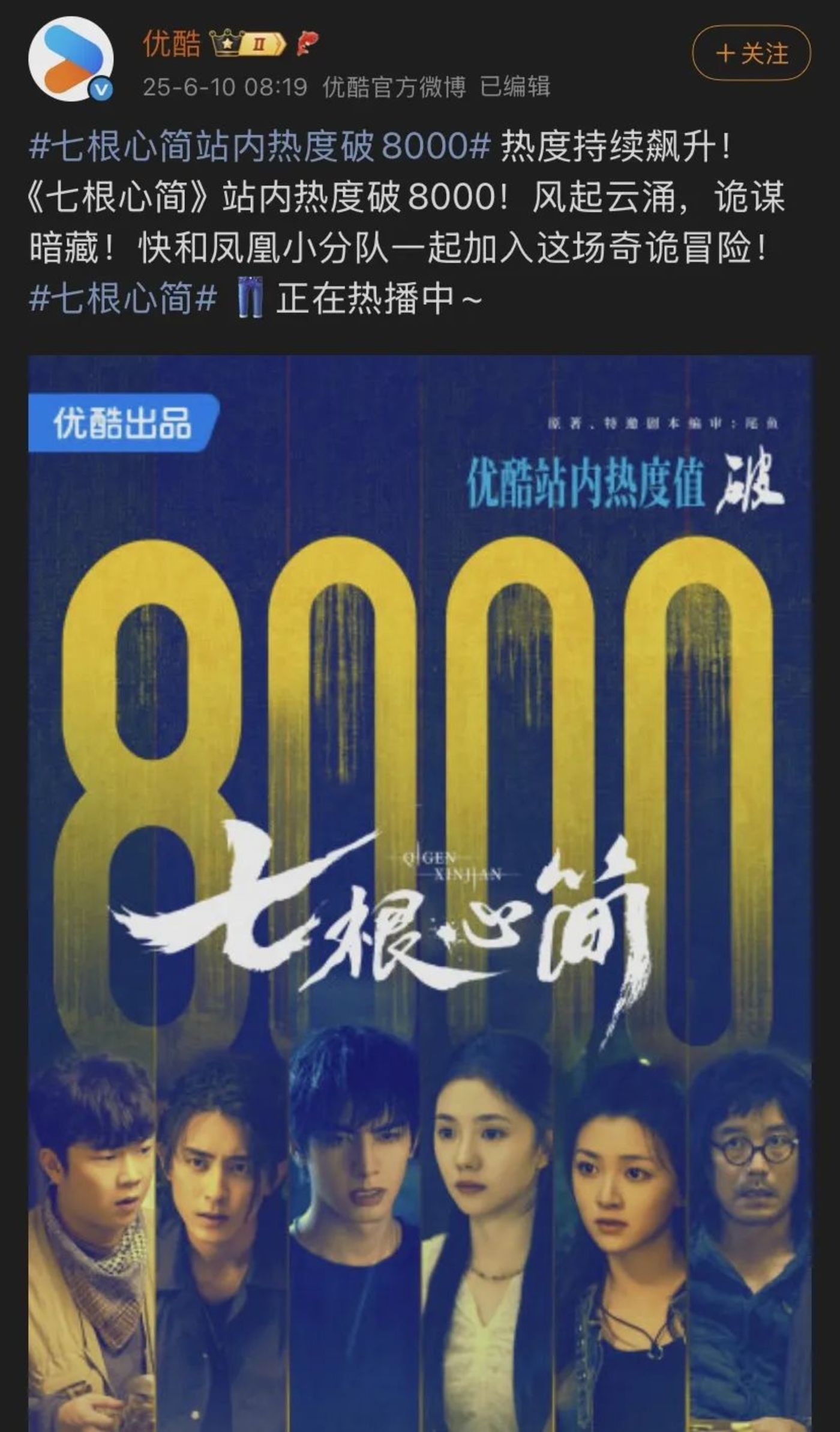 因此,当优酷上线出自尾鱼的《七根心简》当天,首播20分钟热度破6000,当天热度一举突破7000,文章发布当天(6月10日)站内热度破8000,如此迅猛的热度升温也就并不意外了。