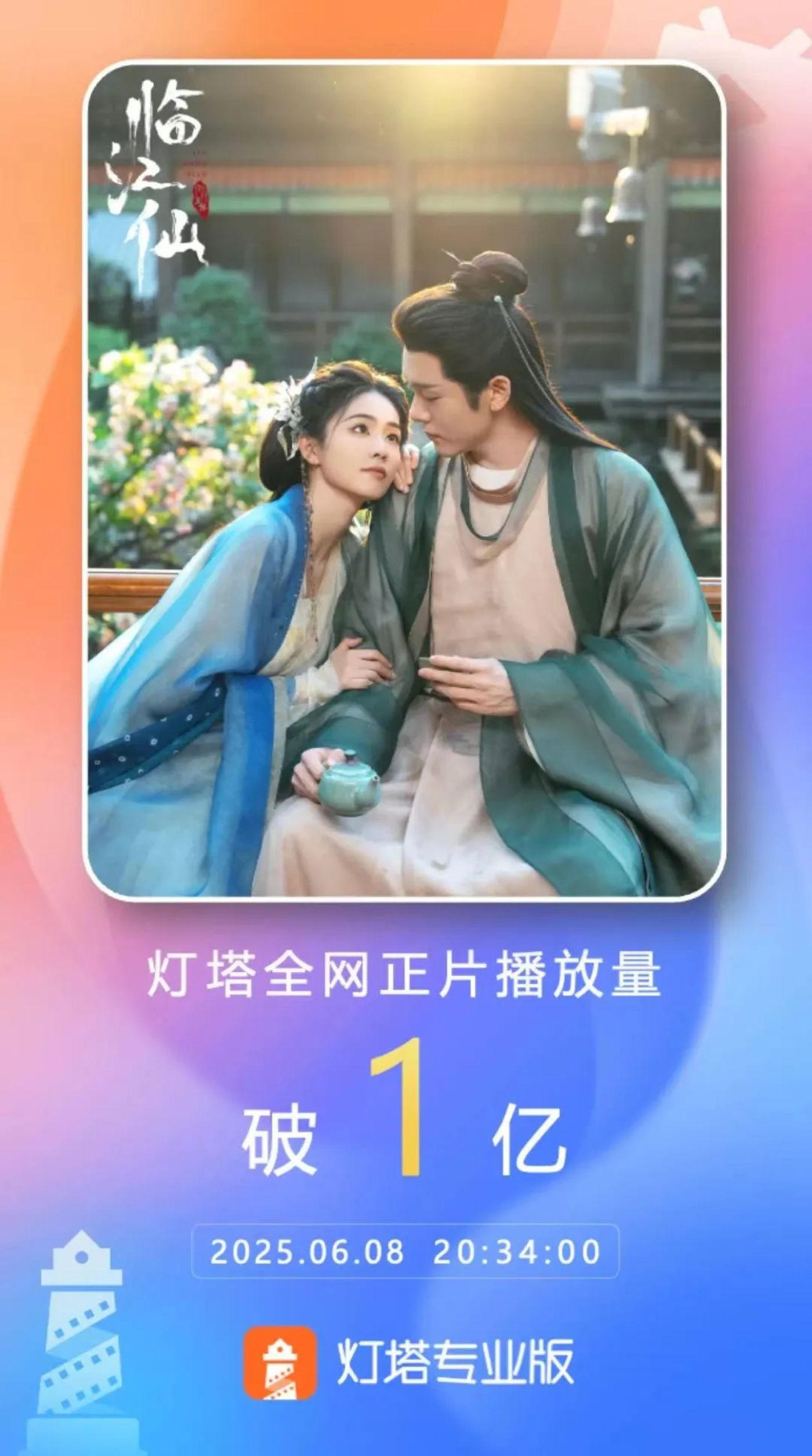 开播首日,《临江仙》就以TOP1的成绩“空降”猫眼剧集实时热度日榜、豆瓣书影音实时热门榜、Vlinkage网剧榜等多个榜单,并在云合数据创下12%市占率的开局成绩。6月8日晚,灯塔专业版专门给《临江仙》制作发布了一张正片播放量破1亿的海报。
