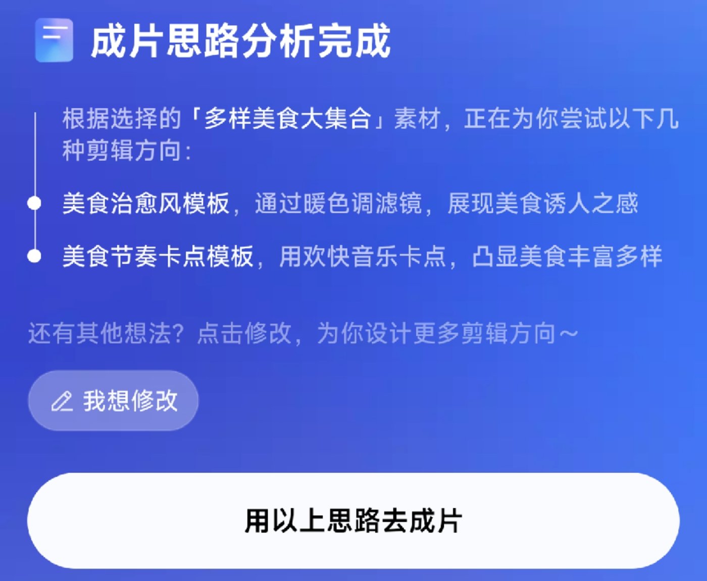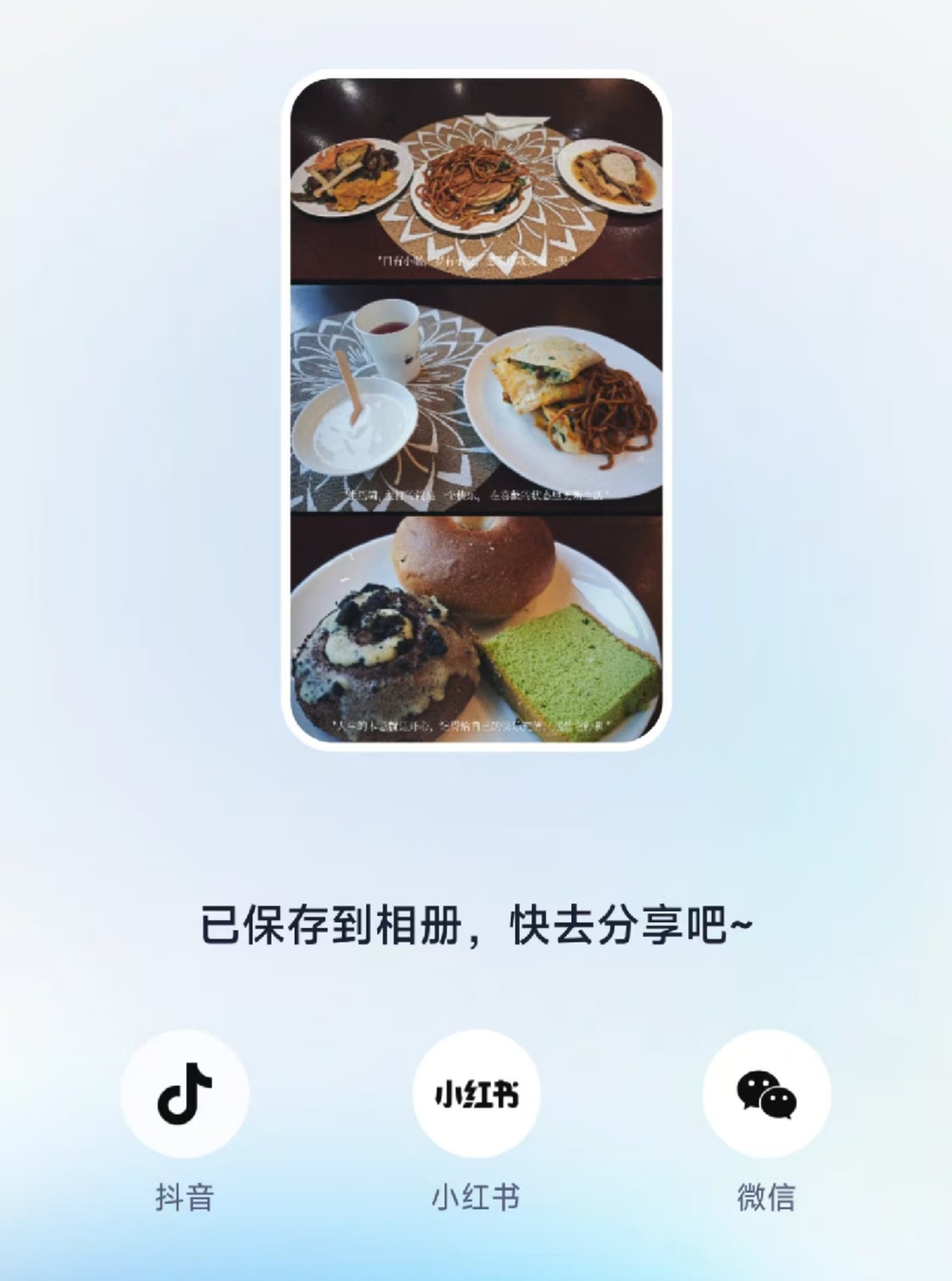 像用了三张美食照片的“日常分享”模板,得到的就是很常规的抖音vlog风,配以优美抒情的文字和音乐,每次看到AI分析得头头是道,但是成品并没有太惊艳的效果,而且给的方案风格依赖预设模版,成品间不会有太大差异。