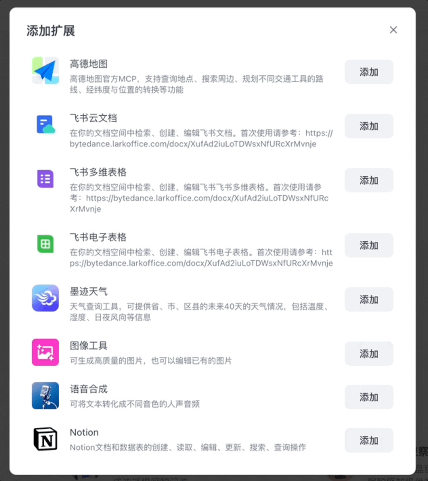 除此之外,扣子也支持MCP协议,并接入了GitHub、MySQL数据库、云文档、天气、地图等一系列MCP应用,进一步简化大模型调用外部服务的流程。