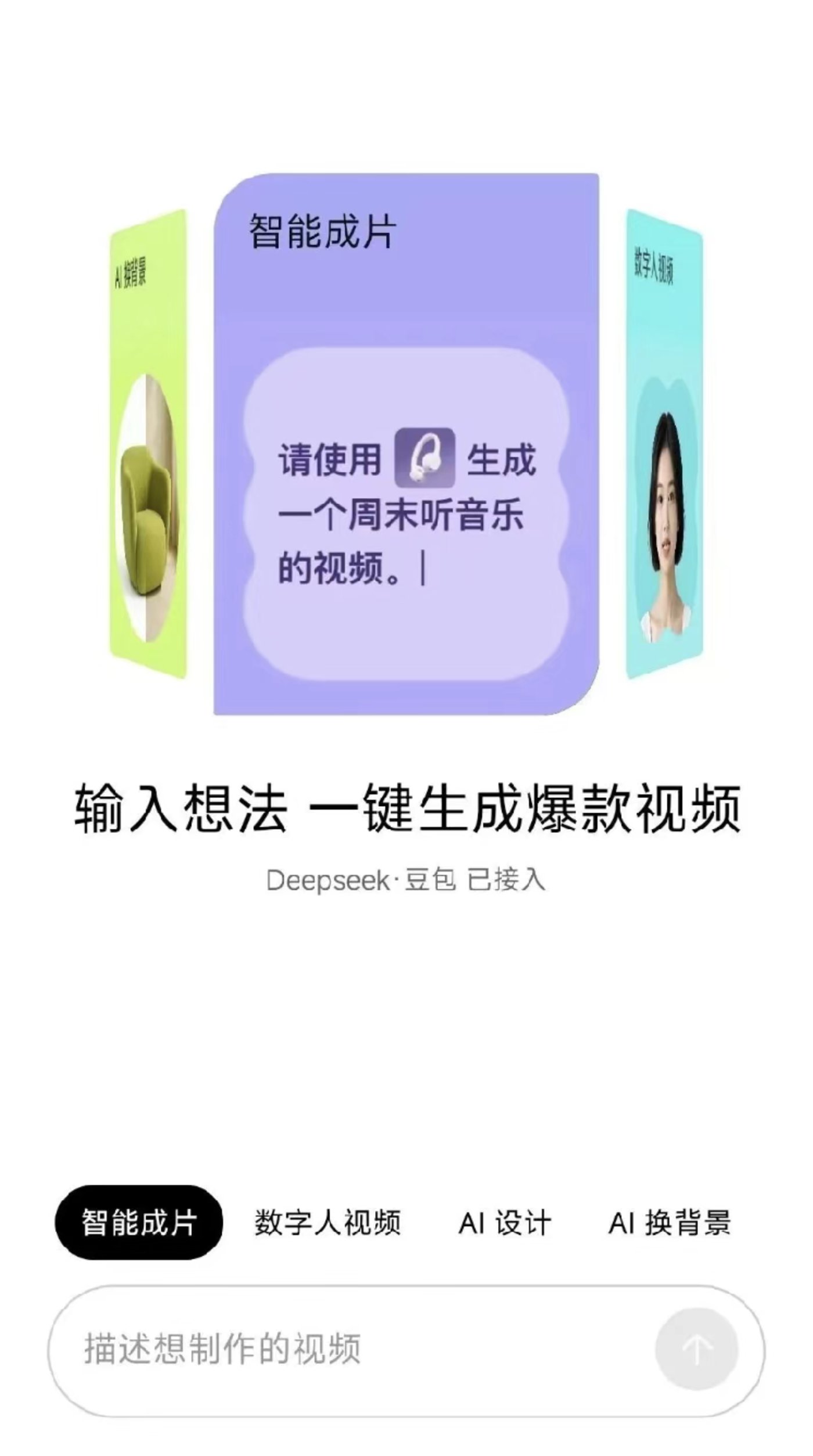 与传统AI工具单一通用输入框不同,「小云雀」会让用户先选定场景,分为智能成片、数字人视频、AI设计、AI背景四个核心功能,防止生成内容偏离需求。