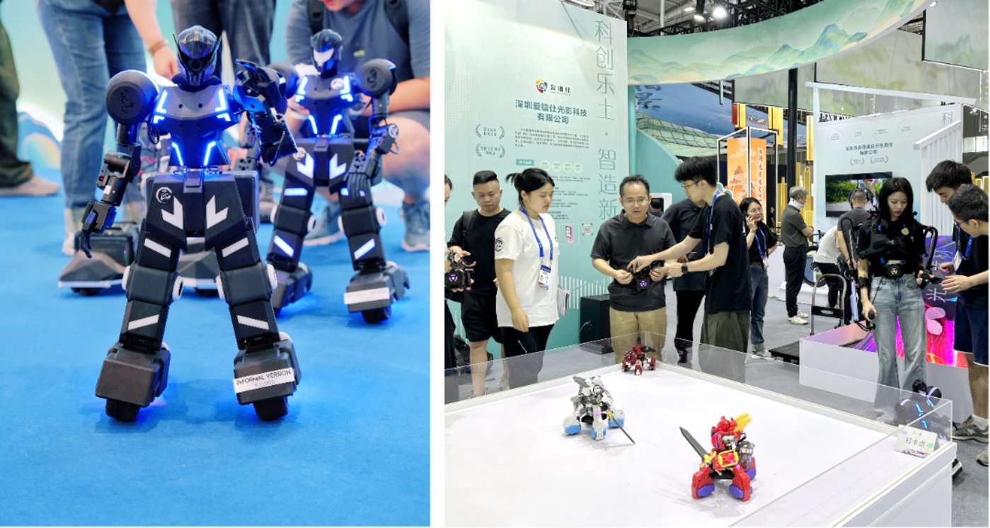 今年的文博会上,光明区设置了一个“智造新势力”展区。其中的功夫机器人擂台,吸引了不少观众的注意力。两台格斗机器人激烈对决,操作者通过穿戴式传感器实现“人机一体”操控,紧张刺激,可玩性强。