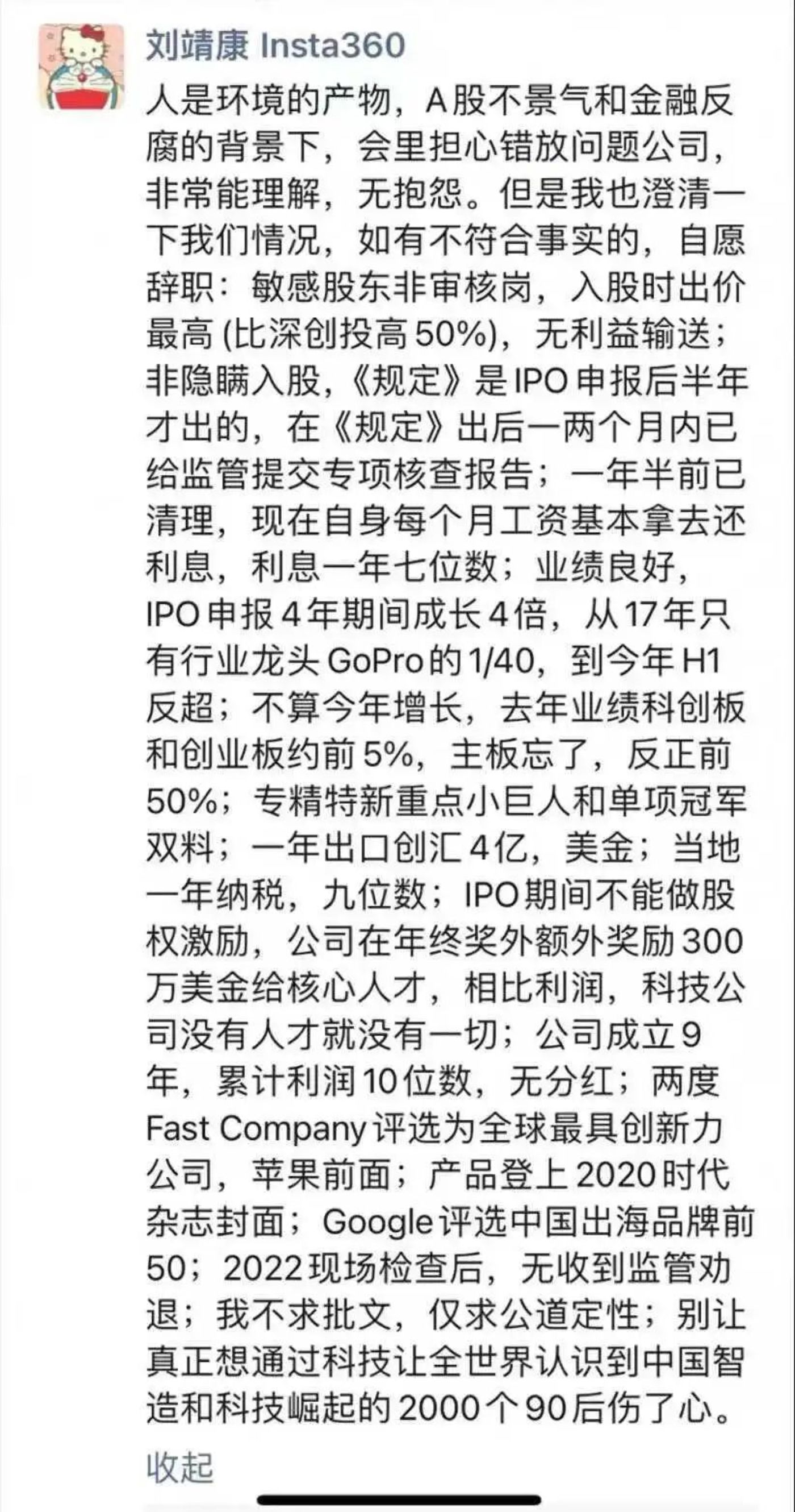 之所以触发了有关部门的格外关注,是因为影石创新曾有一位间接股东为证监会离职人员。尽管最后被证实并无利益输送、隐瞒入股等情况,由于流程的反复“折磨”,2024年8月,刘靖康一度在朋友圈表达不满。