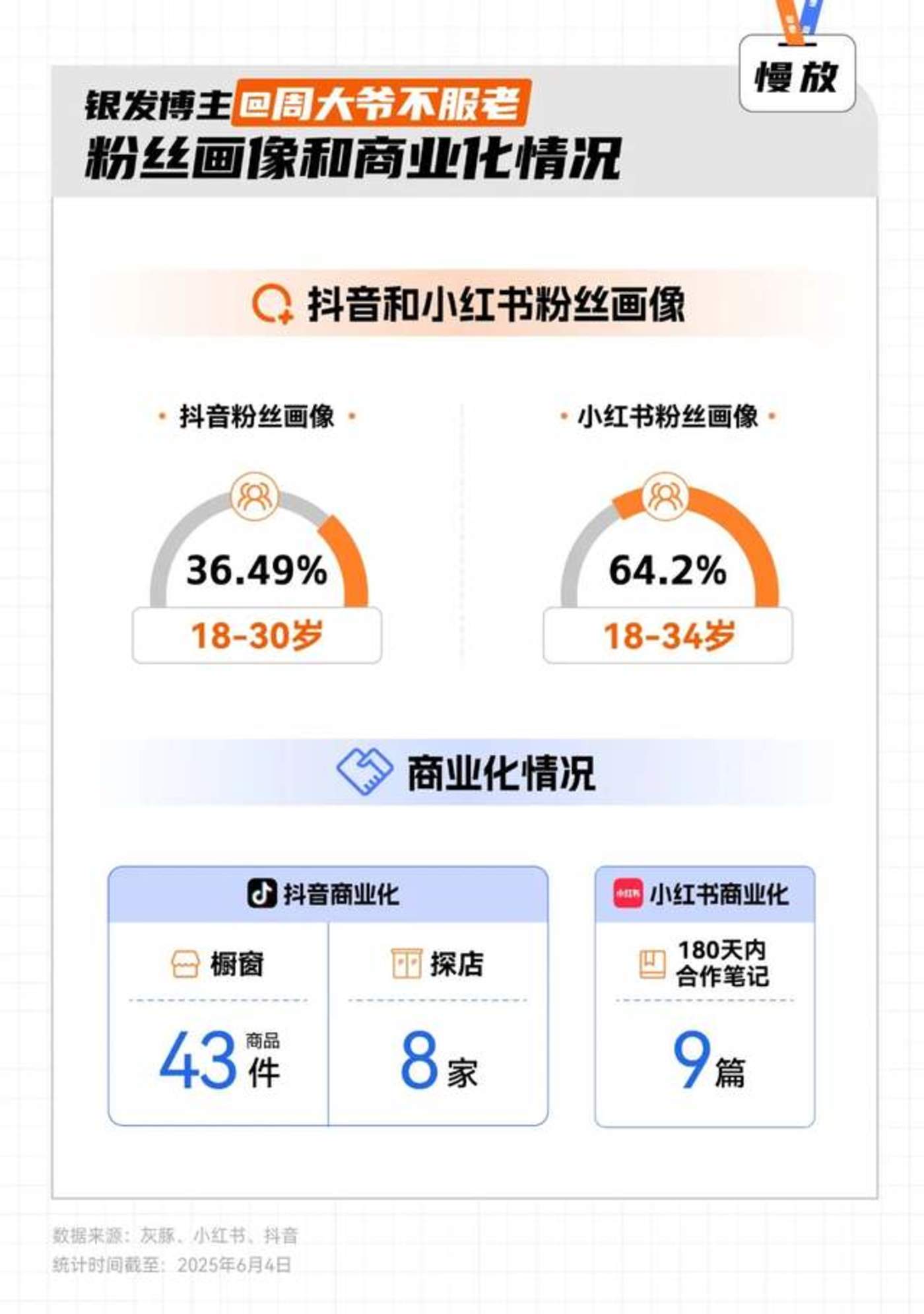 虽然爷奶级博主年龄都不小,但他们的粉丝却大多是年轻人。以@周大爷不服老为例,其抖音账号的核心粉丝集中在18岁-30岁(占比约36.49%),而在小红书,其18岁-34岁的粉丝占比达到了64.2%。因此,这些银发博主们的商业化也是围绕着年轻人的消费展开。