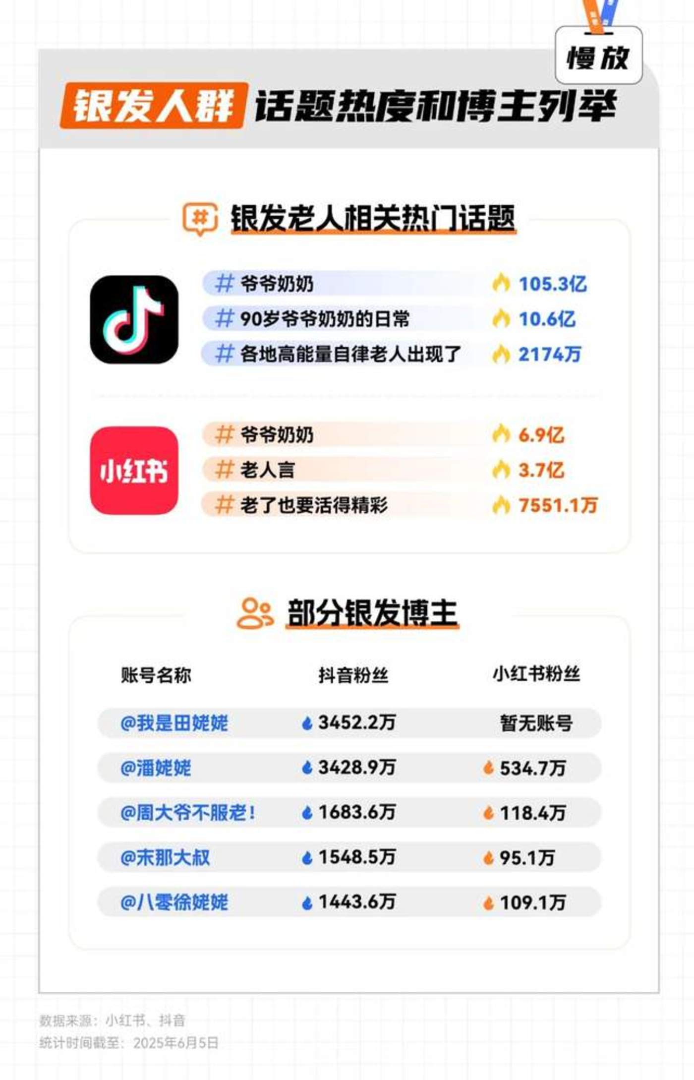银发老人们不仅发得多,还有不少人成为了社交平台的“顶流”。截至2025年6月5日,在抖音,粉丝超百万的银发达人至少有77位,其中@潘姥姥 和 @我是田姥姥 的粉丝量分别达到3428.8万和3454.4万;而在小红书,根据灰豚数据,家庭角色为“奶奶”的创作者达到了221个,其中7位跻身百万粉丝俱乐部。