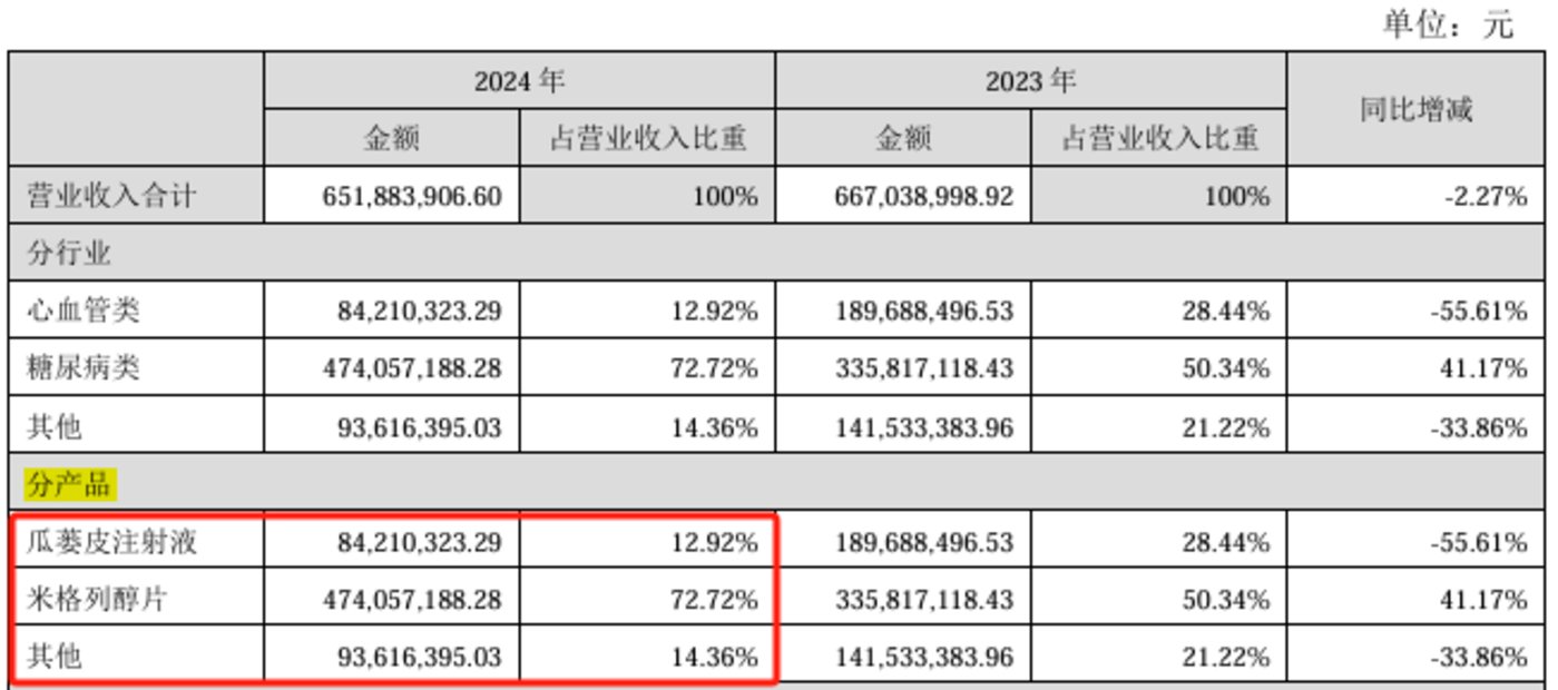 2024年财报显示,易明医药的主营产品除了用于治疗糖尿病的米格列醇片以外,还有心血管用药瓜蒌皮注射液、乳腺增生用药红金消结片、消化不良用药多潘立酮片、腹泻用药蒙脱石散、急性中毒用药盐酸纳美芬注射液等。其中降糖药营收占比超70%,剩余营收由其他药物贡献。