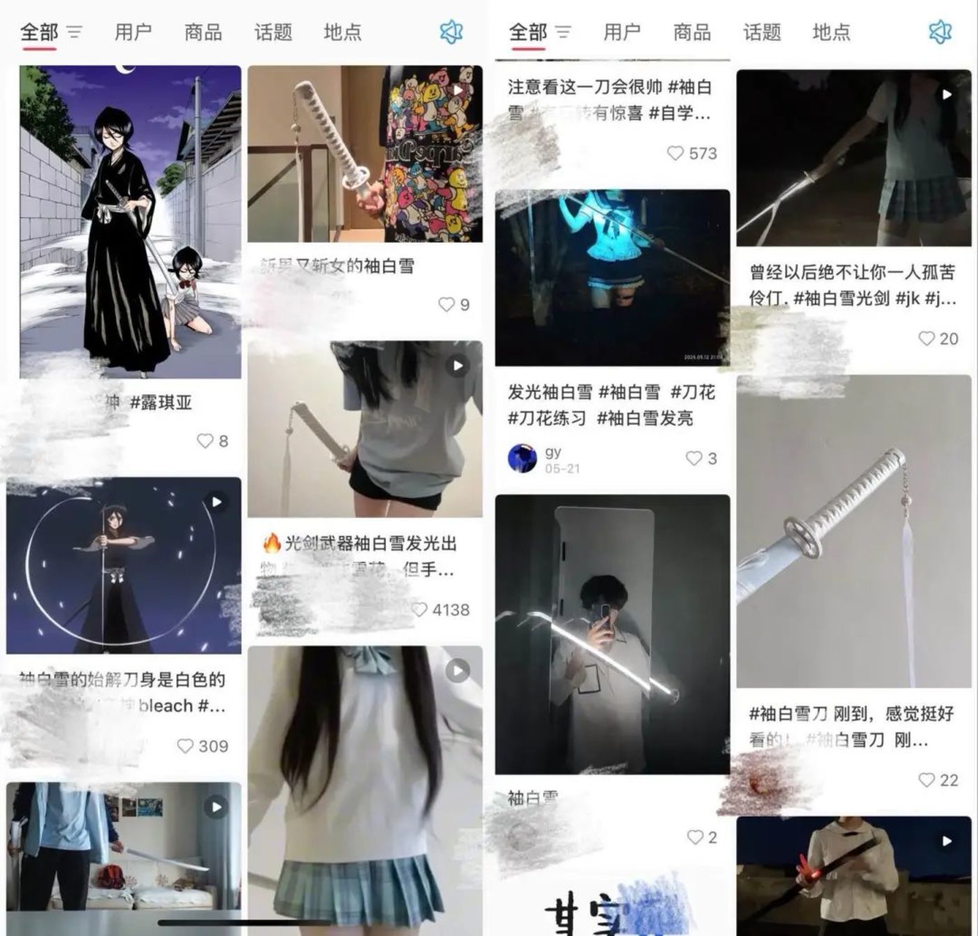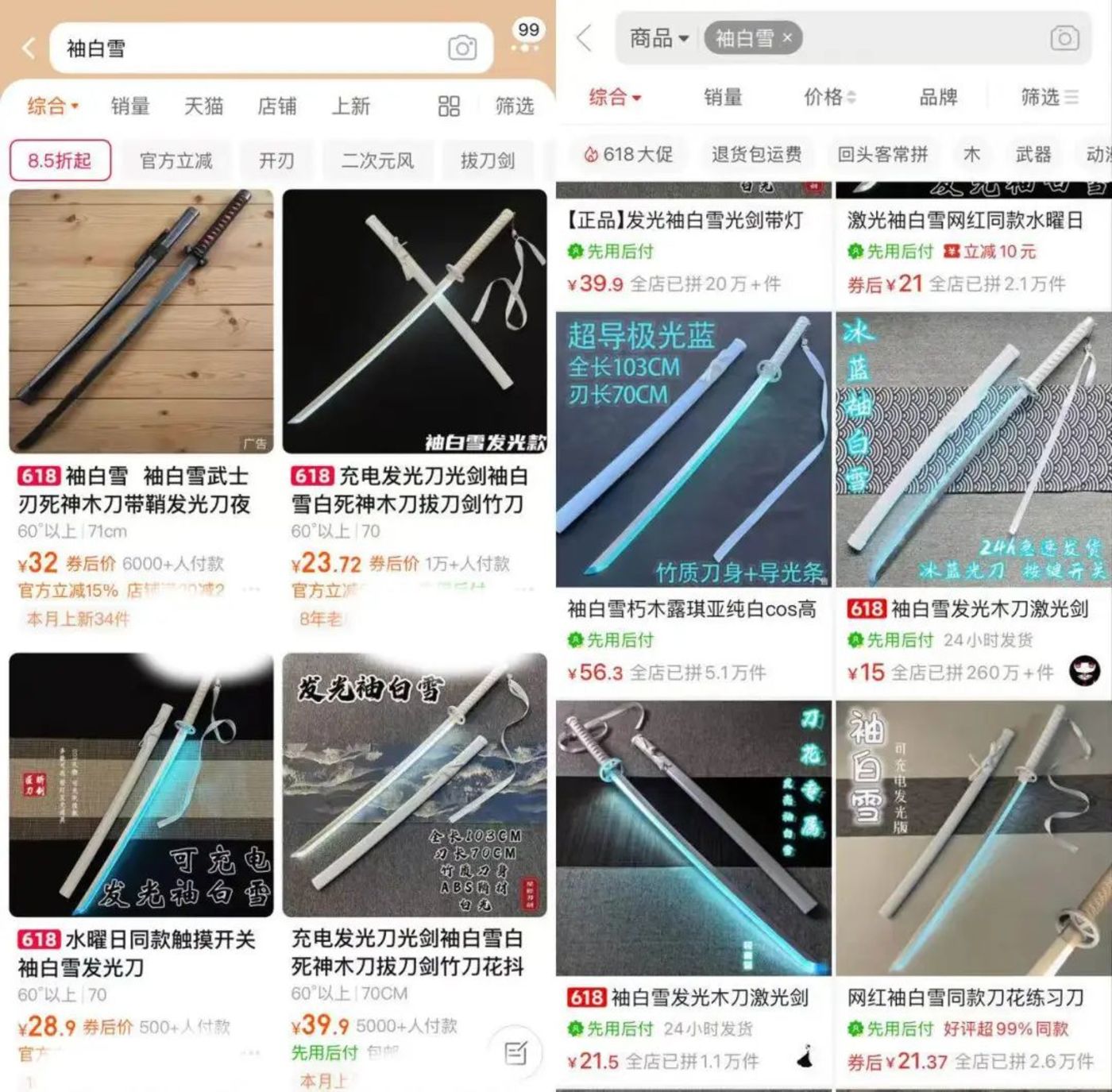 在电商平台,搜索这种会发光、带彩带的cosplay玩具刀,拼单高达260+万件;而在短视频平台,#发光袖白雪 也有超182万次播放。