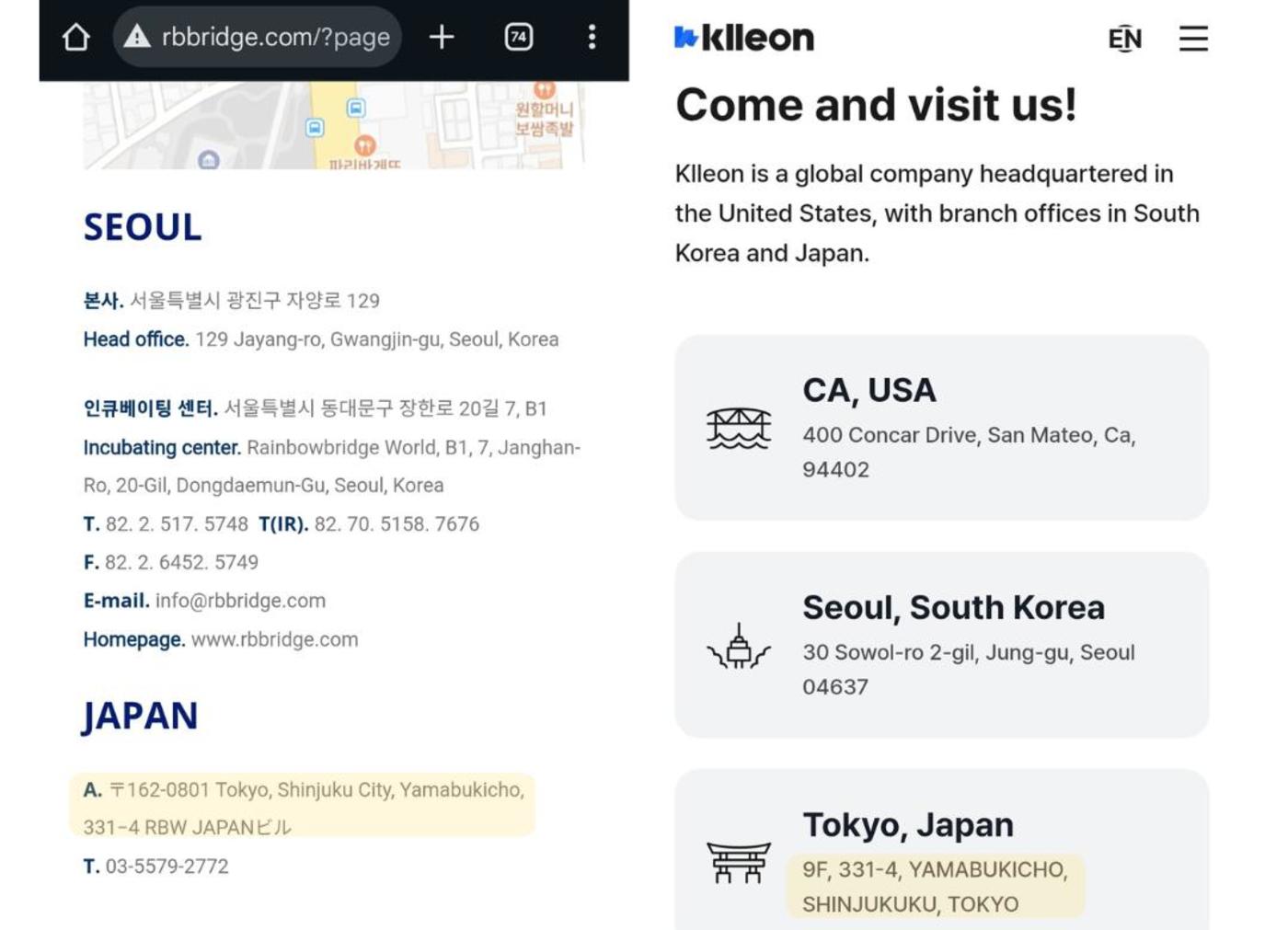 据韩媒《Digital Daily》报道,RBW在2023年就已参与KLLEON的A轮融资,成为公司战略股东之一。根据商业登记信息,两家公司在日本市场的分公司地址也高度重合,有分析认为二者在海外市场开拓中可能存在资源整合、渠道共享等合作。
