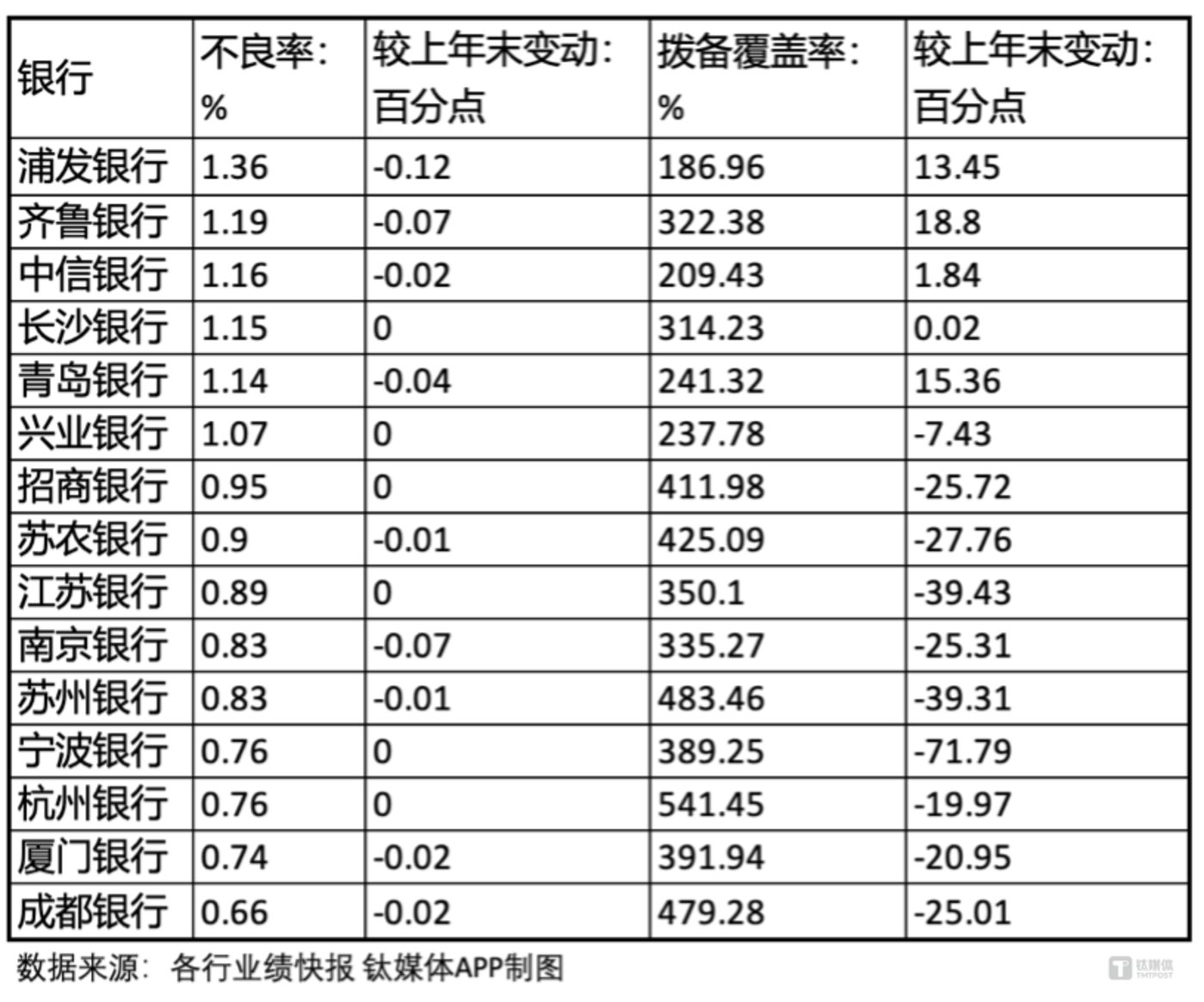 从不良率看,15家银行(郑州银行未披露)的不良贷款率均较上年末持平或下降,其中,浦发银行下降最多,下降0.12个百分点至1.36%,但是不良率依旧是15家银行中最高的。