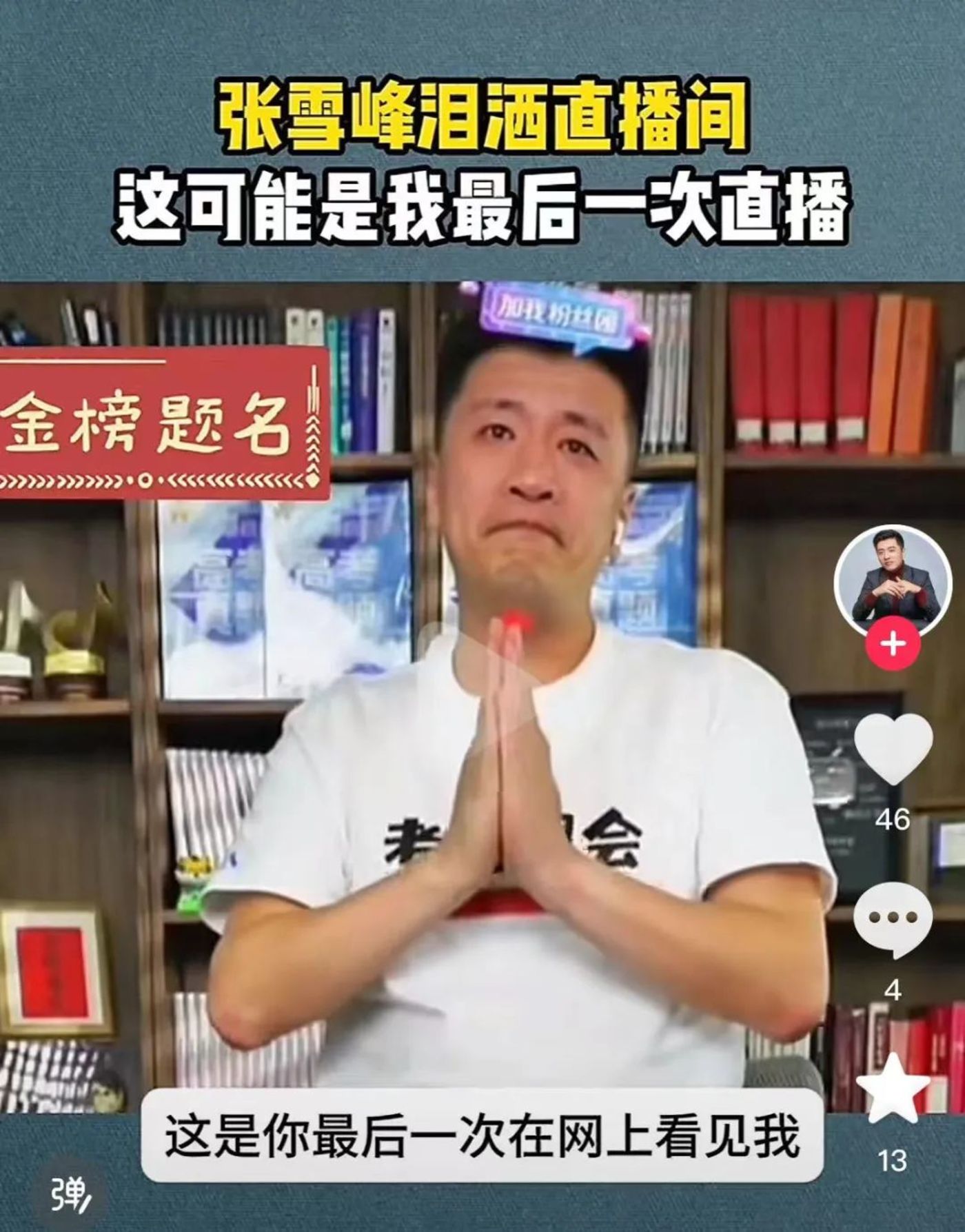 先是前几天,张雪峰因“在直播间含泪退出”登上热搜。视频中,他眼含热泪,跟观众坦诚“动了太多人的蛋糕”“这可能是你最后一次在网上见到我”“我真的已经尽力了”“张雪峰没有对不起任何人”。