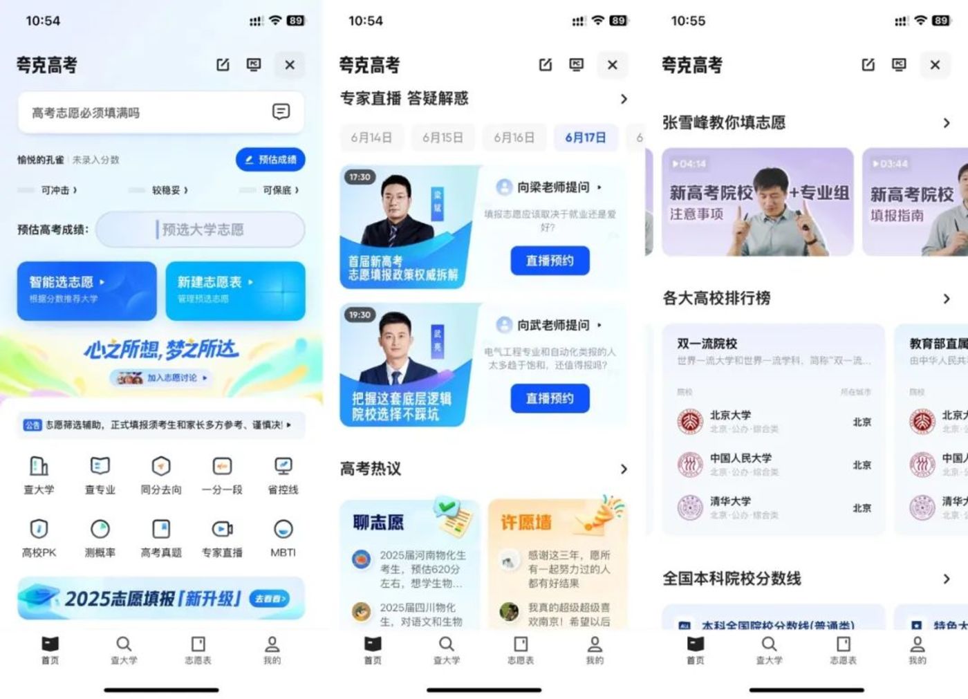 打开夸克浏览器,可以看到有个一级入口“夸克高考”,整体可以分为志愿预估、专家直播、各大高校排行榜等界面。还在小图标栏有“同分去向”“一分一段”等10个实用小功能。