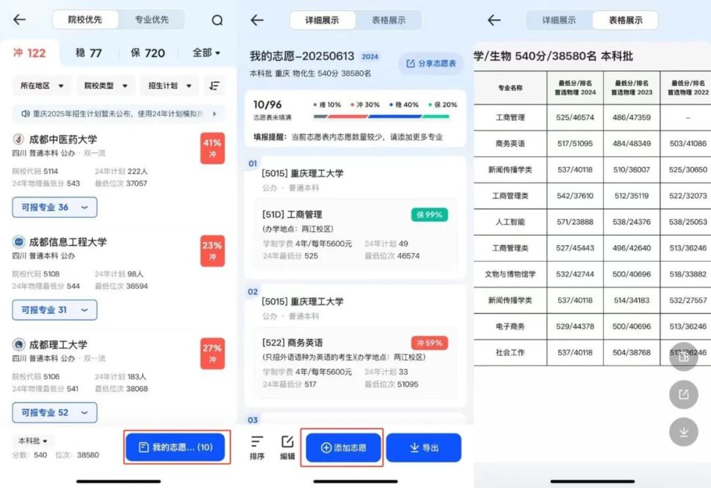 填好之后,就可以看到相应成绩档位的志愿预估填报了。按照“极点商业”输入的“540分重庆考生,物化生”条件,可以看到下面的志愿填报推荐分为“冲”“稳”“保”三个档次的学校。