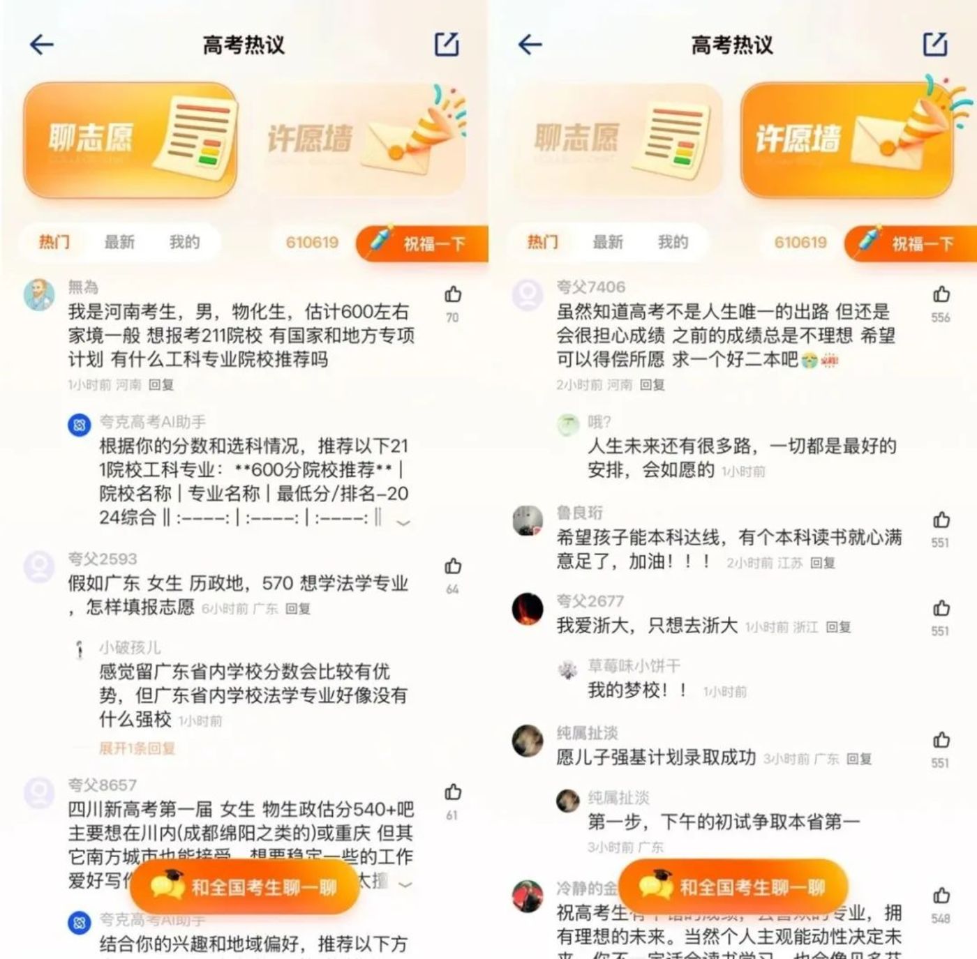 在高考热议栏还有“聊志愿”和“许愿墙”两个功能,最后回复时间比较近,“1小时前”“2小时前”,可以看出这个功能使用人数还是比较多的。