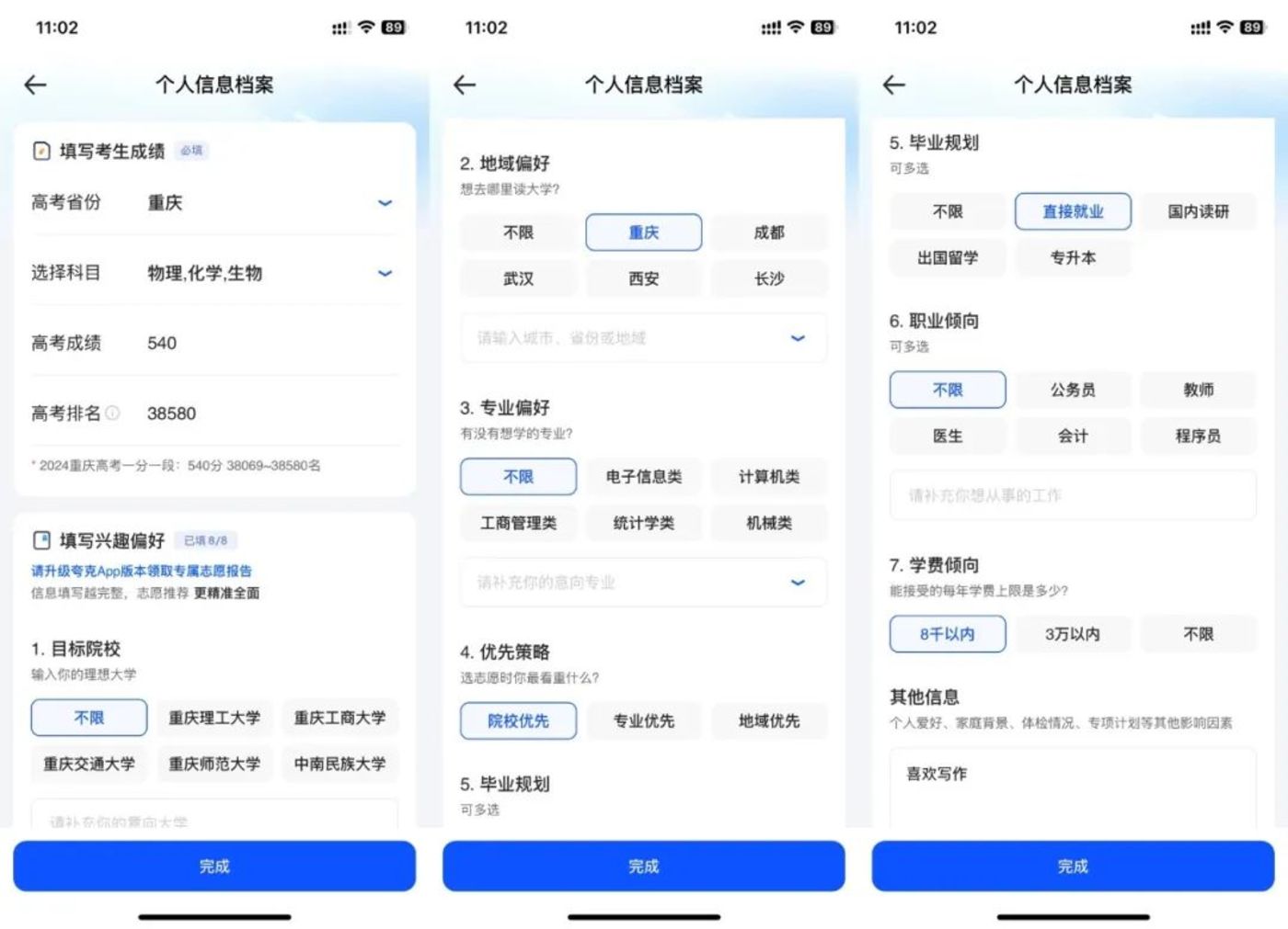 点击首页预估成绩按钮后,会跳出来信息填报,填好分数和科目之后,还需要填地域偏好、专业偏好、职业倾向等个人档案。