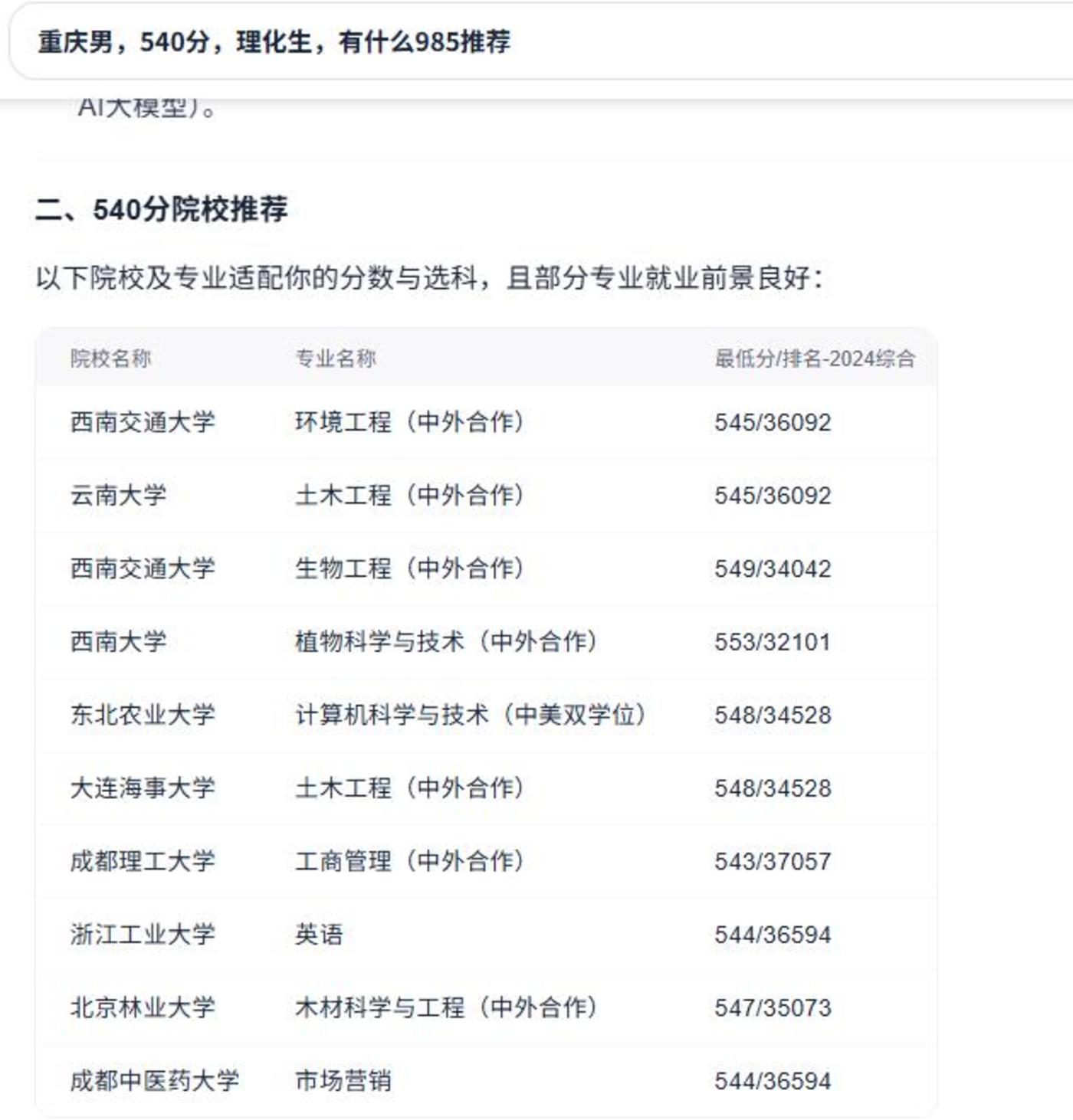 上述博主认为,AI结果和大模型的训练数据、推理能力等息息相关。从夸克AI选志愿实际表现看,训练数据质量并不高,或者推理能力有待提升。