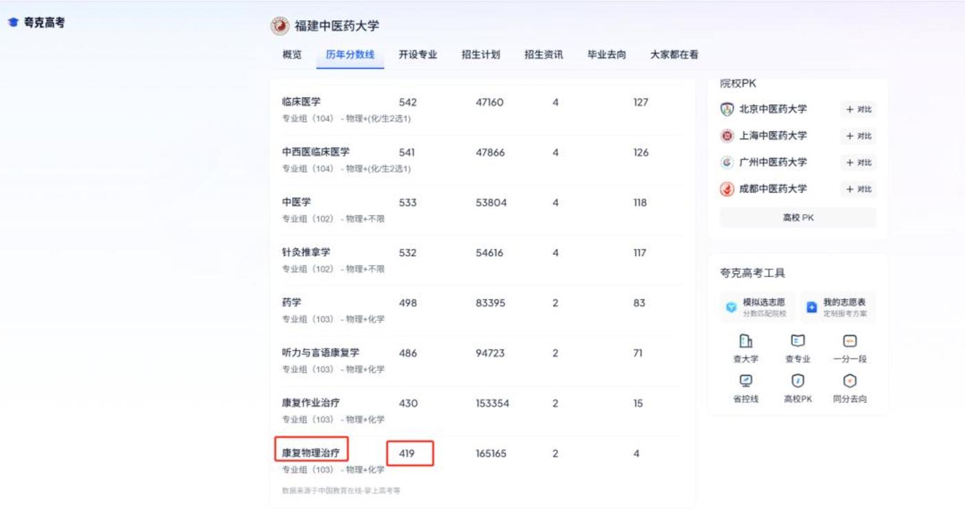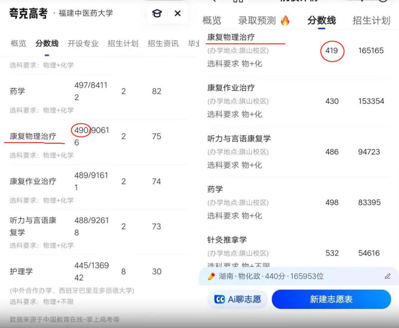 以福建中医药大学为例,“康复物理治疗”专业在湖南省2023年夸克高考上的分数线为490分,而根据官方数据该项分数为419分。