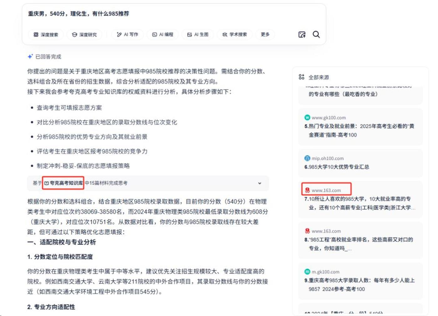 值得一提的是,夸克还升级了搜索体验,提升到了AI深度搜索。在对话框里输入相应的问题就可以得到智能回答。例如搜索“540分有什么985推荐”,下面就会跳出来智能回答。让人意外的是,夸克没有根据提问预设筛选一些985高校,而是自动匹配了540分数段对应的院校推荐。