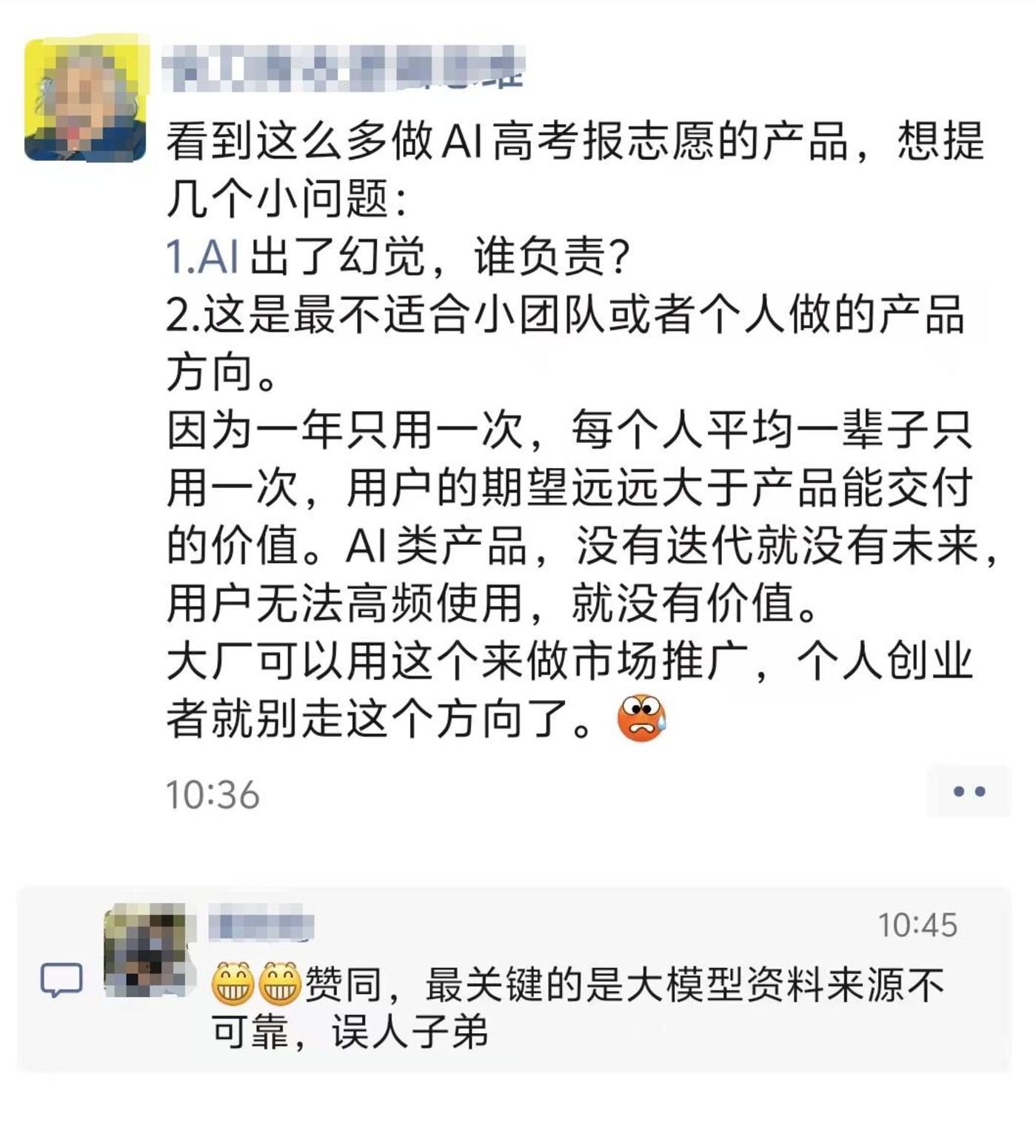 逻辑思维联合创始人“快刀青衣”就表示,一旦AI高考大模型出现幻觉问题,向考生推荐了错误的志愿填报信息,导致考生无法被心仪院校录取甚至滑档,这个责任谁来承担?谁来为考生的前途负责?