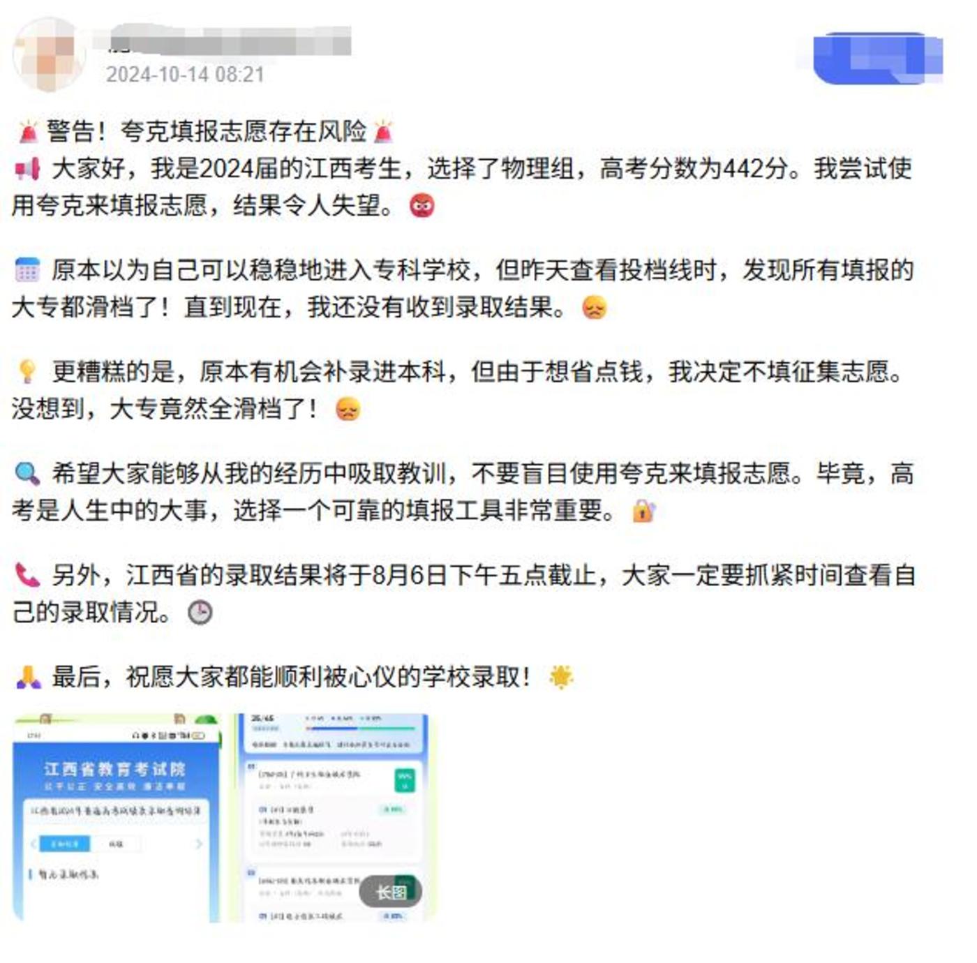 2024年被影响的还不止上面一位,还有用户在社交平台上曝出,自己是2024年的江西考生,物理组高考442分,他尝试用夸克来填报志愿,结果所有学校都滑档了。