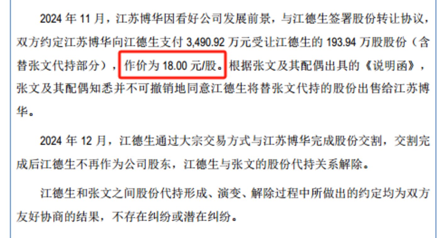 另外,在2024年11月,也就是沈岩翔完成受让的次月,外部投资者江苏博华以每股18元的价格,收购了江德生所持有的通领科技股权。这一价格较沈岩翔的受让价高出了整整5.5元,溢价幅度高达33.33%,同时也显著高于按上市估值推算出的每股价值15.48元。这种“内部转让价低于上市预期价、外部收购价又高于内部价”的双重价差,形成了极为罕见的价格倒挂现象。这种“内外有别”的定价模式,难免让人质疑项春潮是否通过低价转让股份向沈岩翔进行利益输送,或存在“上市前突击入股”的特殊安排。