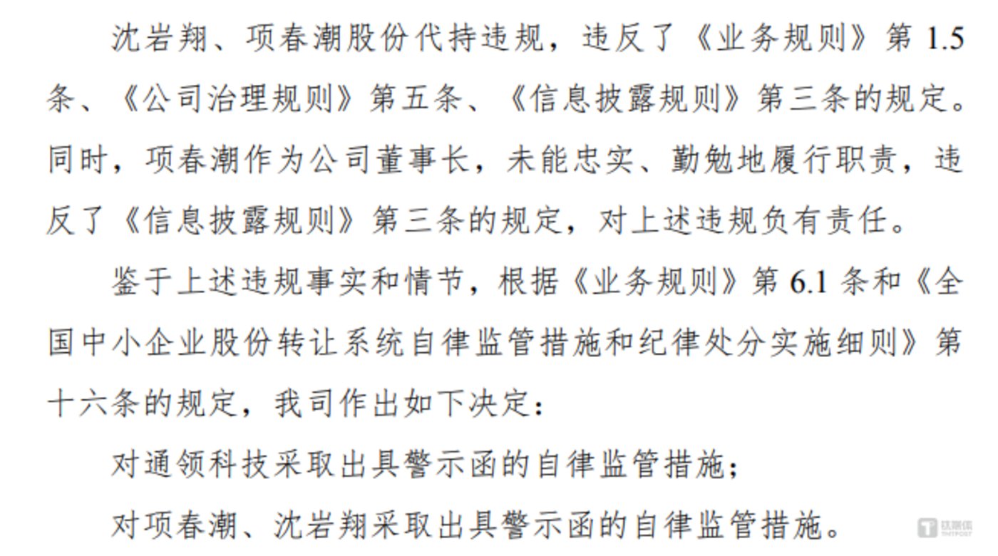 仅仅两个月后,2024年12月,全国股转公司的一纸决定,将通领科技这起股份代持事件推向了舆论风口。全国股转公司向通领科技及相关人士采取自律监管措施的决定,该决定主要是2018年2月沈岩翔代项春潮持有通领科技股份构成股份代持违规,而针对该行为,通领科技未及时披露相关情况,因此全国股转公司挂牌公司管理一部对对通领科技采取出具警示函的自律监管措施;对项春潮、沈岩翔采取出具警示函的自律监管措施。这不仅是对违规行为的严肃警告,更是给通领科技的上市之路蒙上了一层厚重的阴影。