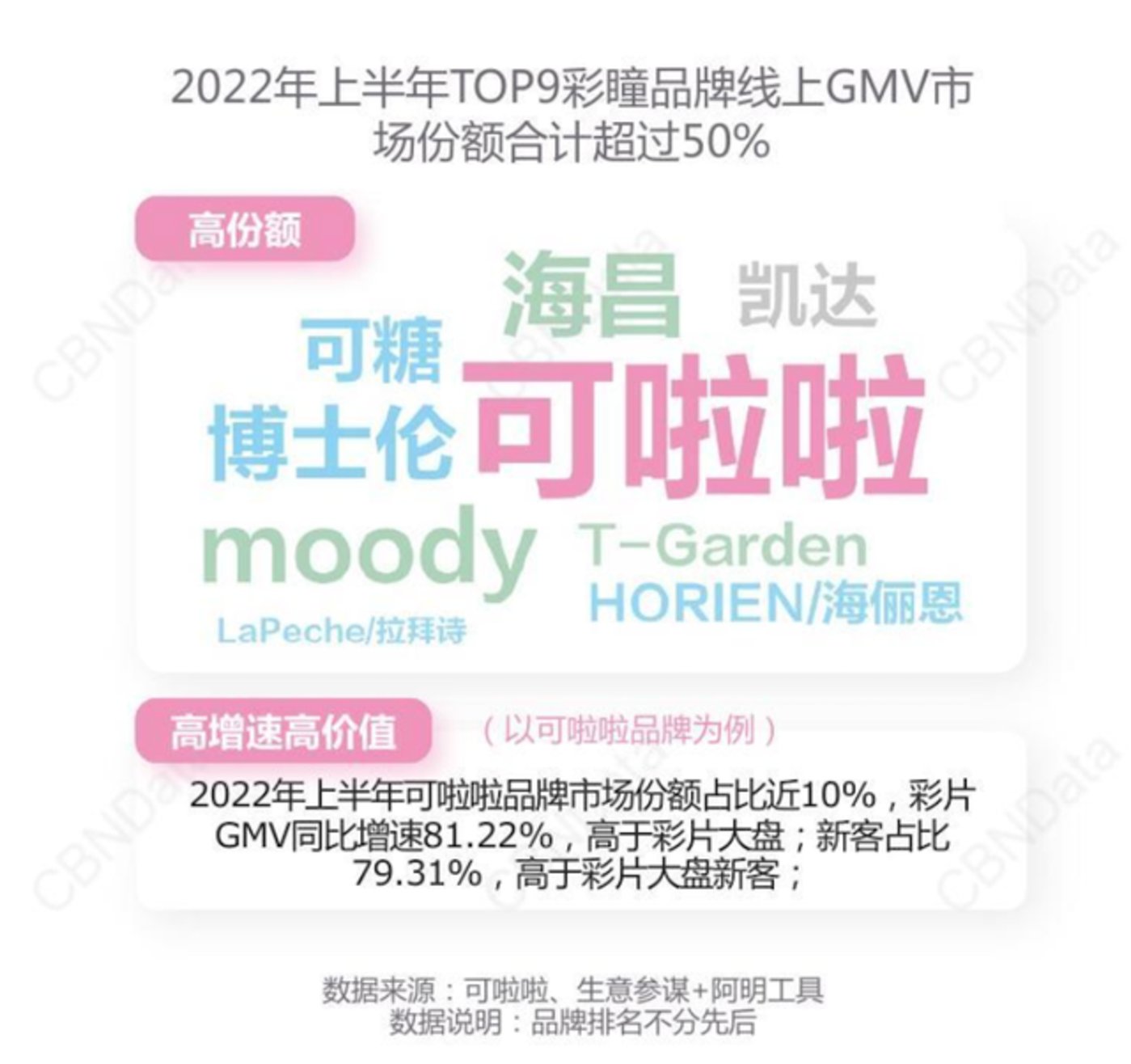 在品牌上,国货彩瞳品牌凭借丰富的产品花色,以及更切中消费者痛点的营销方式不断崛起。根据CBNData发布的《国货彩瞳美妆化消费趋势洞察》显示,2022年上半年TOP9彩瞳品牌线上GMV市场份额合计超过50%。