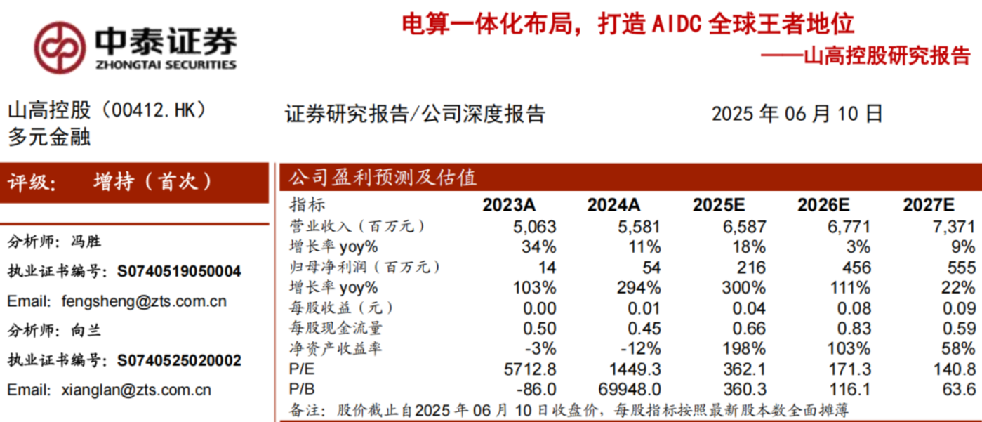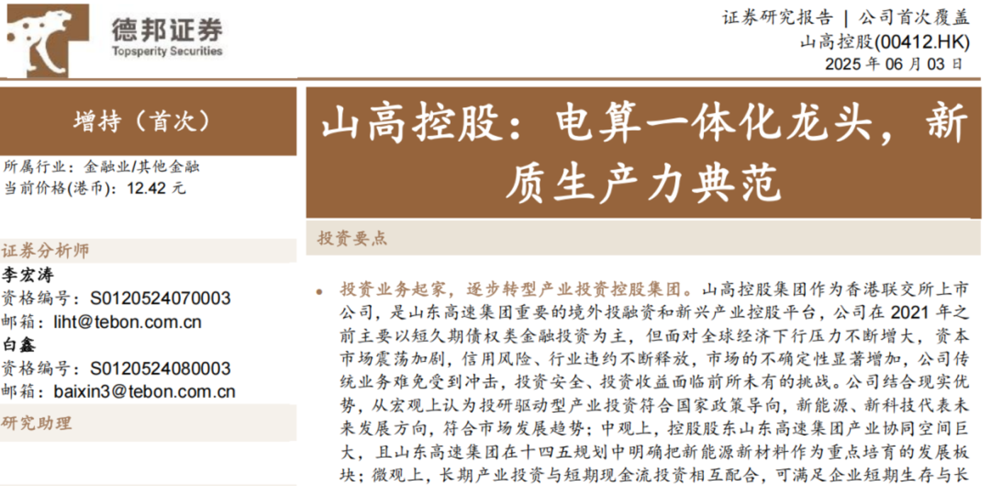德邦证券则指出,山高控股是电算一体化龙头,新质生产力的典范。