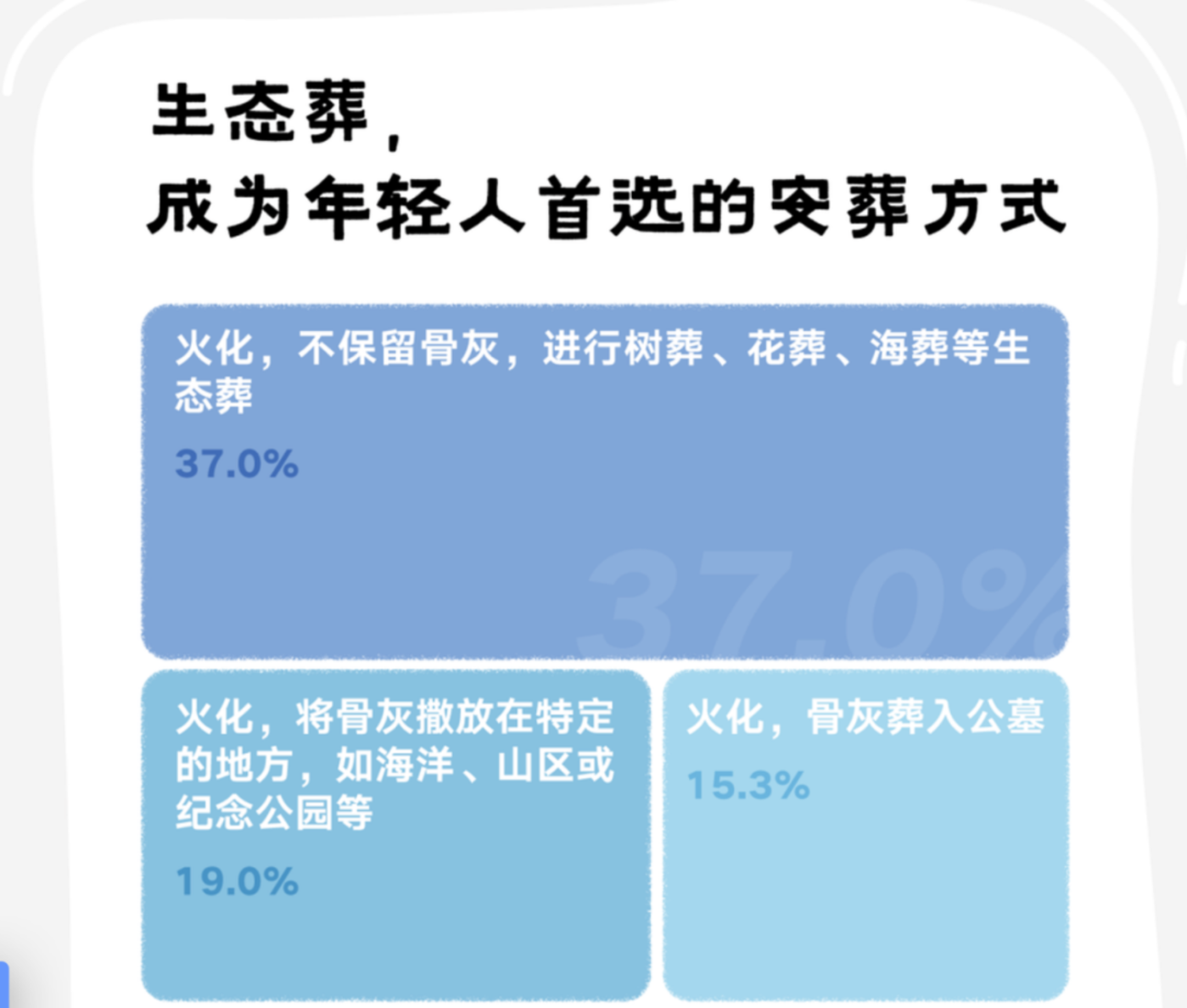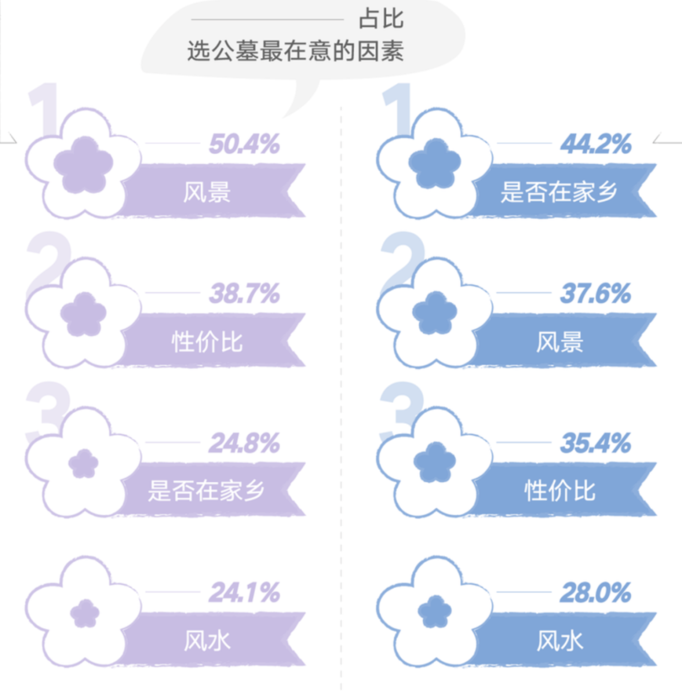 这种观念直接影响了他们对葬礼形式、流程及相关用品的选择。比如无论男女,对墓地的选择,性价比这个因素都排在了风水的前面;再比如,树葬、花葬等节地生态安葬方式,更受到容易受到他们的认同。