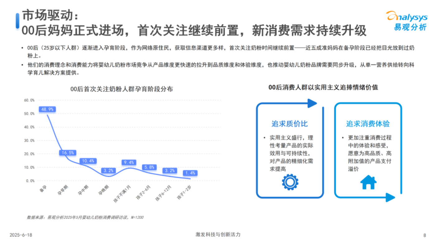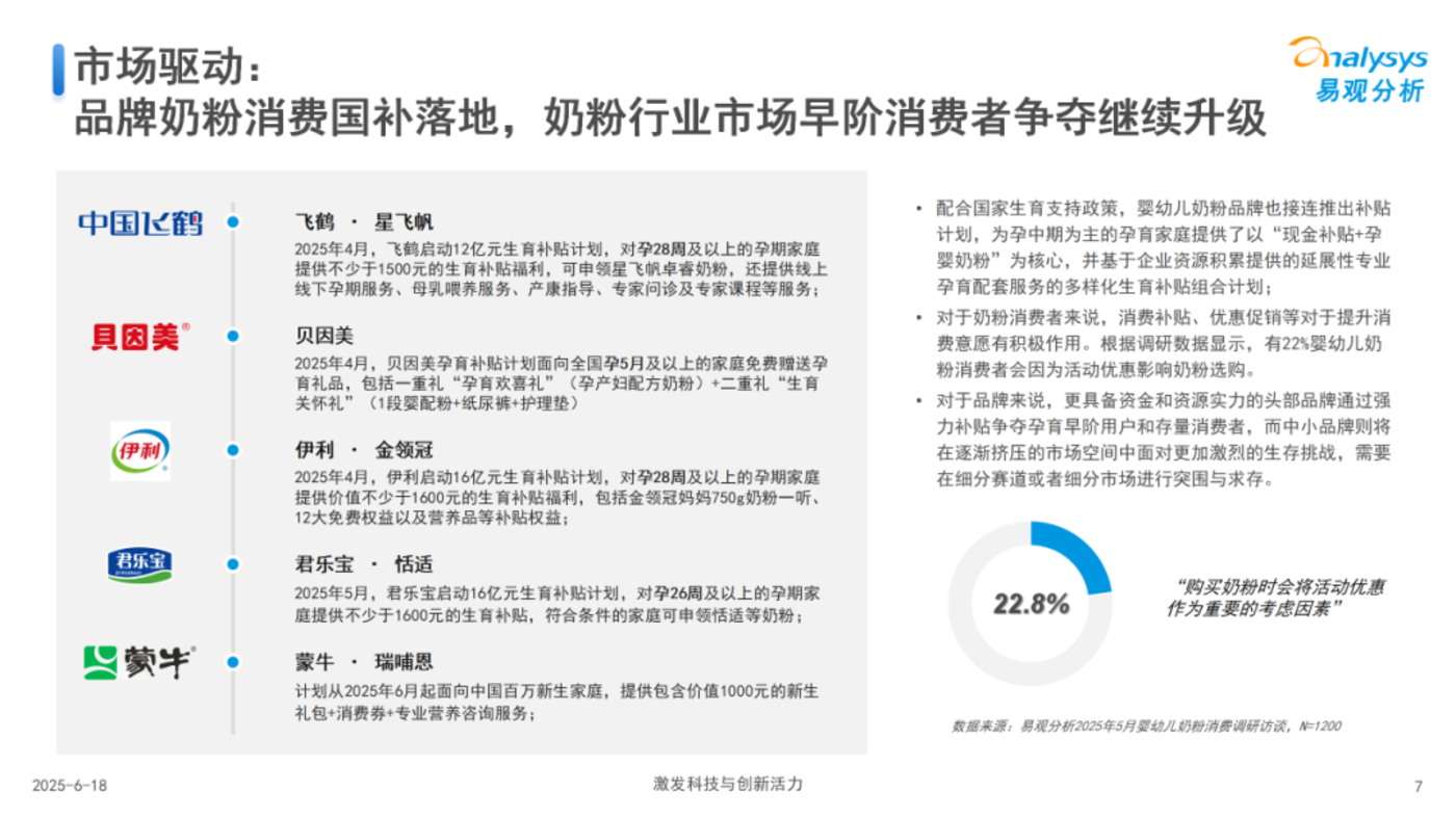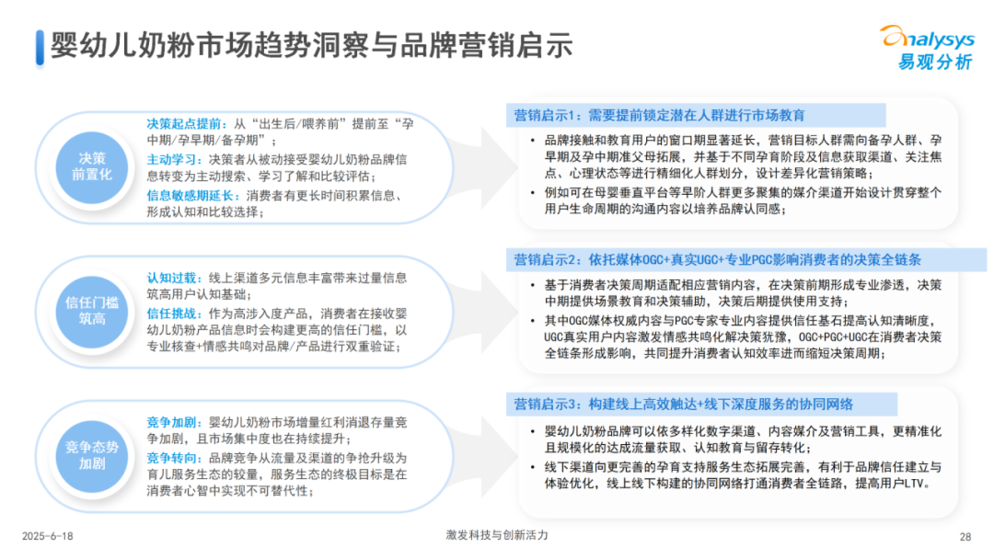2025年国内消费市场复苏加快,居民消费意愿和消费信心不断释放,婴幼儿奶粉消费市场在生育率反弹和生育支持政策等多因素推进下进入新一轮的增长通道。对于品牌来说,一方面是新一代消费者的消费理念和消费能力将婴幼儿奶粉市场竞争从产品维度更快速地拉升到品质维度和体验维度;另一方面,更具备资金和资源实力的头部品牌通过强力补贴争夺孕育早阶用户和存量消费者,而中小品牌则将在逐渐挤压的市场空间中面对更加激烈的生存挑战,需要在细分赛道或者细分市场进行突围与求存。