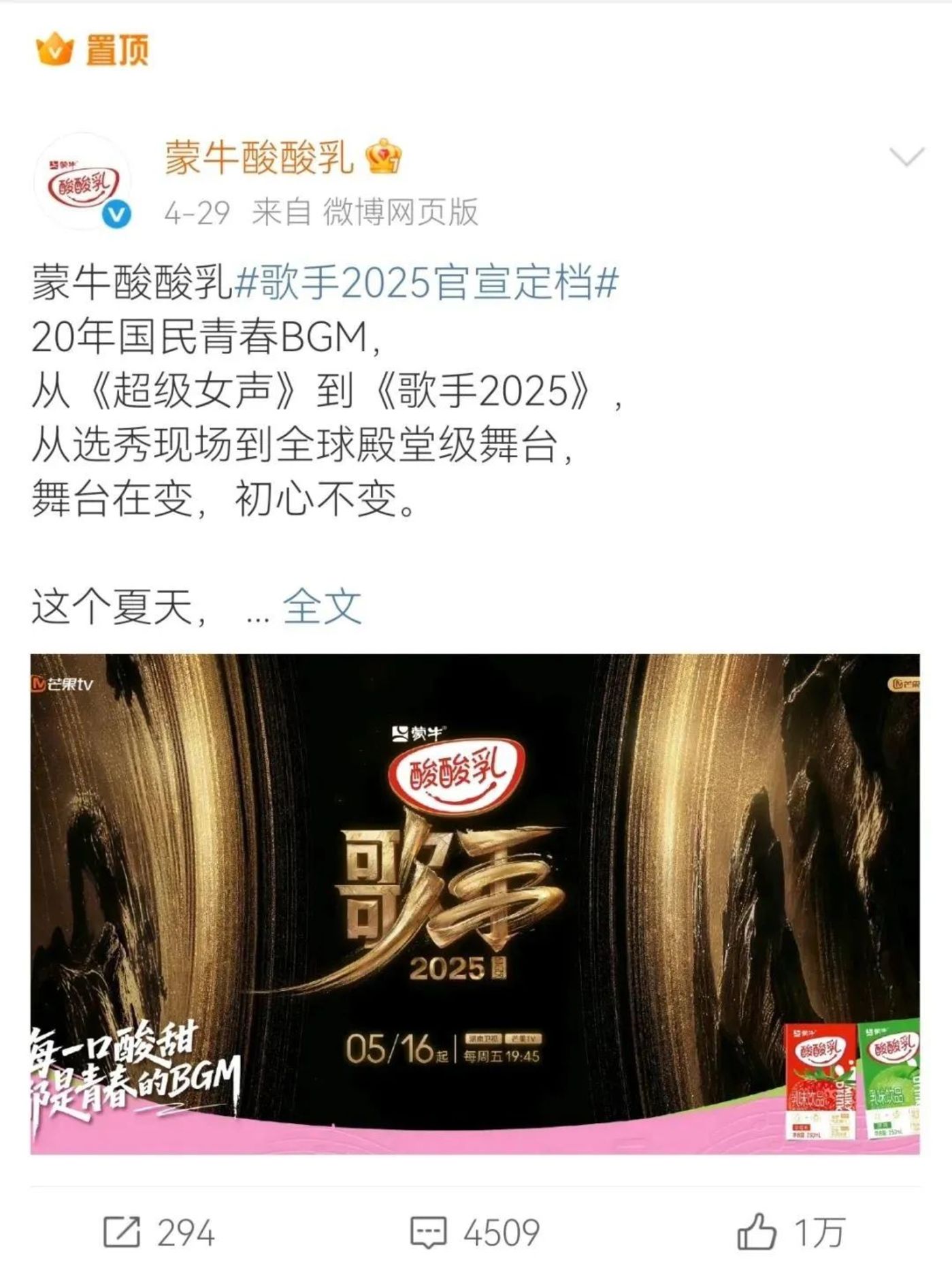 果不其然,《歌手2025》一经官宣,老粉情绪高涨,芒果台的老搭档蒙牛也带着自己当家品牌蒙牛酸酸乳继续冠名支持,并在官微置顶玩起了“回忆杀”:“从超女快男到歌手舞台,20年守护你的音乐梦!”强调品牌自“超女快男”时代以来对音乐梦想的长期守护。