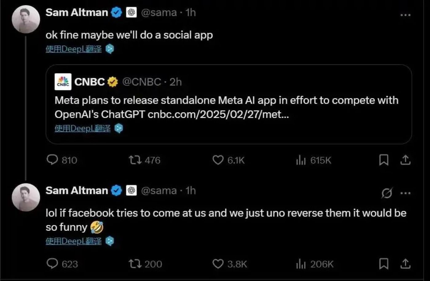 今年2月28日,CNBC报道称,Meta旗下的AI助手Meta AI即将成为该社交媒体公司的独立应用,目标直指OpenAI和谷歌母公司Alphabet等竞争对手。对此,OpenAI奥特曼回应道:“要不我们去做一款社交APP?”并在社交媒体的评论区写道,“如果Facebook想找我们麻烦,我们直接‘反杀’他们,那场面一定超搞笑。”